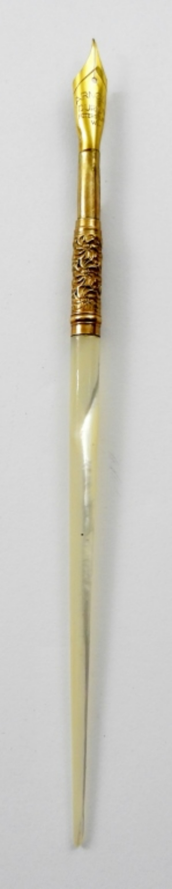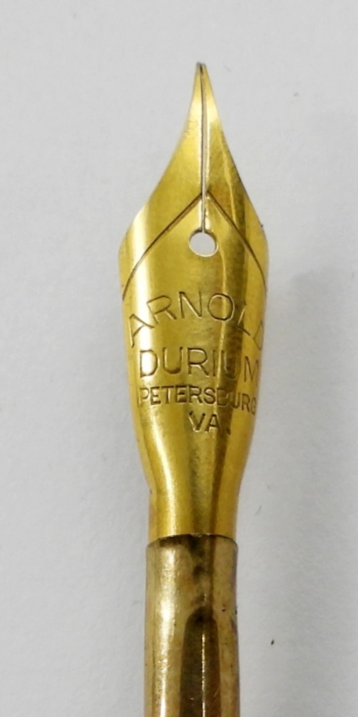 FINE POINT (SLIGHTLY BENT) GOLD ARNOLD DURIUM (PETERSBURG VA) NIB IN PEARL DIP PEN HOLDER, ORIGINAL BOXES (WORN)