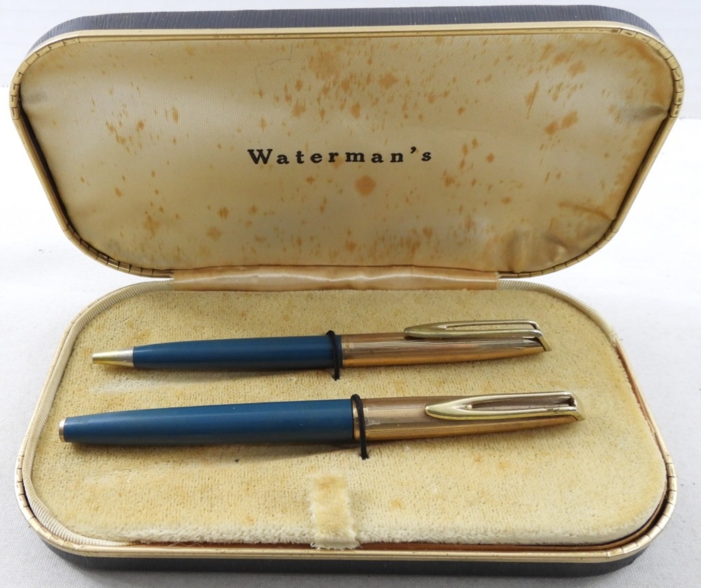 WATERMAN’S C.F FOUNTAIN PEN AND BALLPOINT PEN SET (BLUE) IN ORIGINAL PACKAGING WITH INSTRUCTIONS AND CARTRIDGES, MADE IN USA, FINE POINT 14K NIB, UNTESTED, SLIGHT INK RESIDUE BUT OTHERWISE GOOD CONDITION