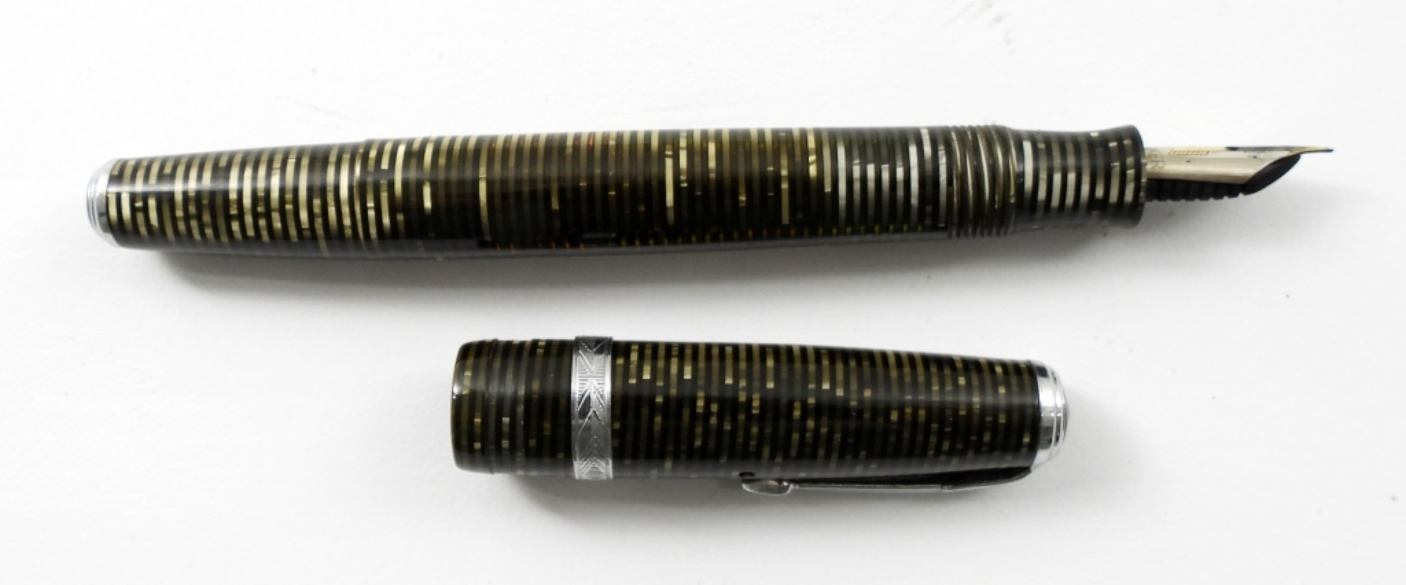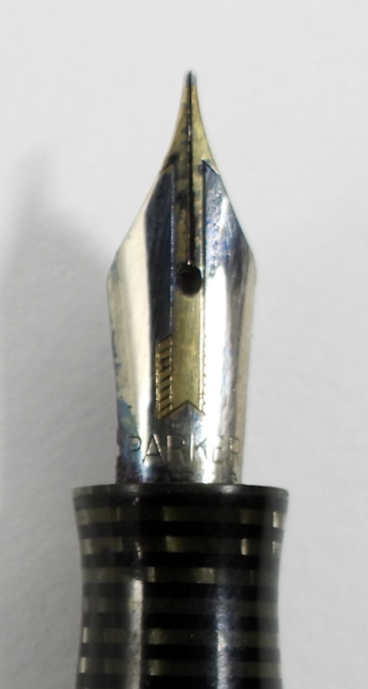 VINTAGE PARKER VACUMATIC GRAY STRIPE, UNTESTED BUT CARTRIDGE REFILL SPRING WORKING, FINE POINT NIB