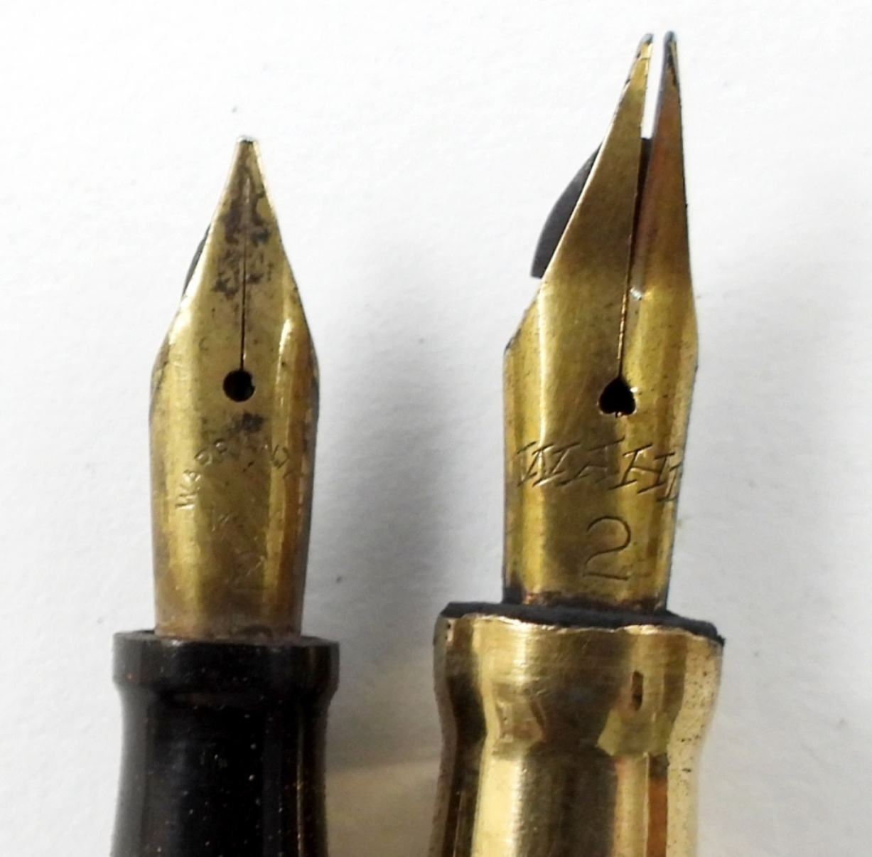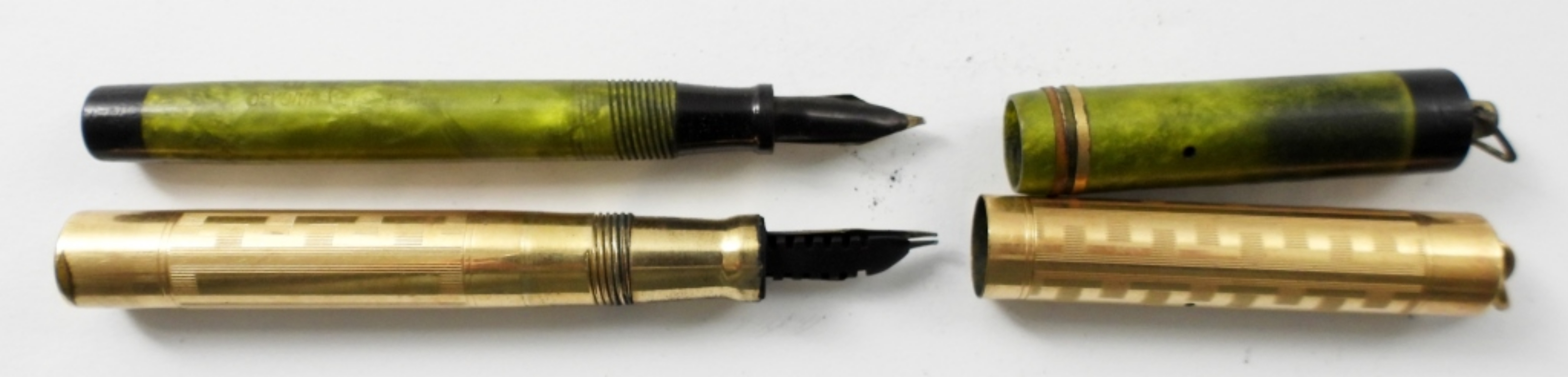 1920’S SHEAFFER 5-30 RING TOP FOUNTAIN PEN, GREEN JADE FINISH, BASIC WARRANTED NO 2 FINE TO MEDIUM NIB, LEVER FILL. WAHL PEN GOLD FILLED RING TOP PEN WITH WAHL NIB NO 2 (NIB CROSSED/BENT), LEVER FILL CARTRIDGE