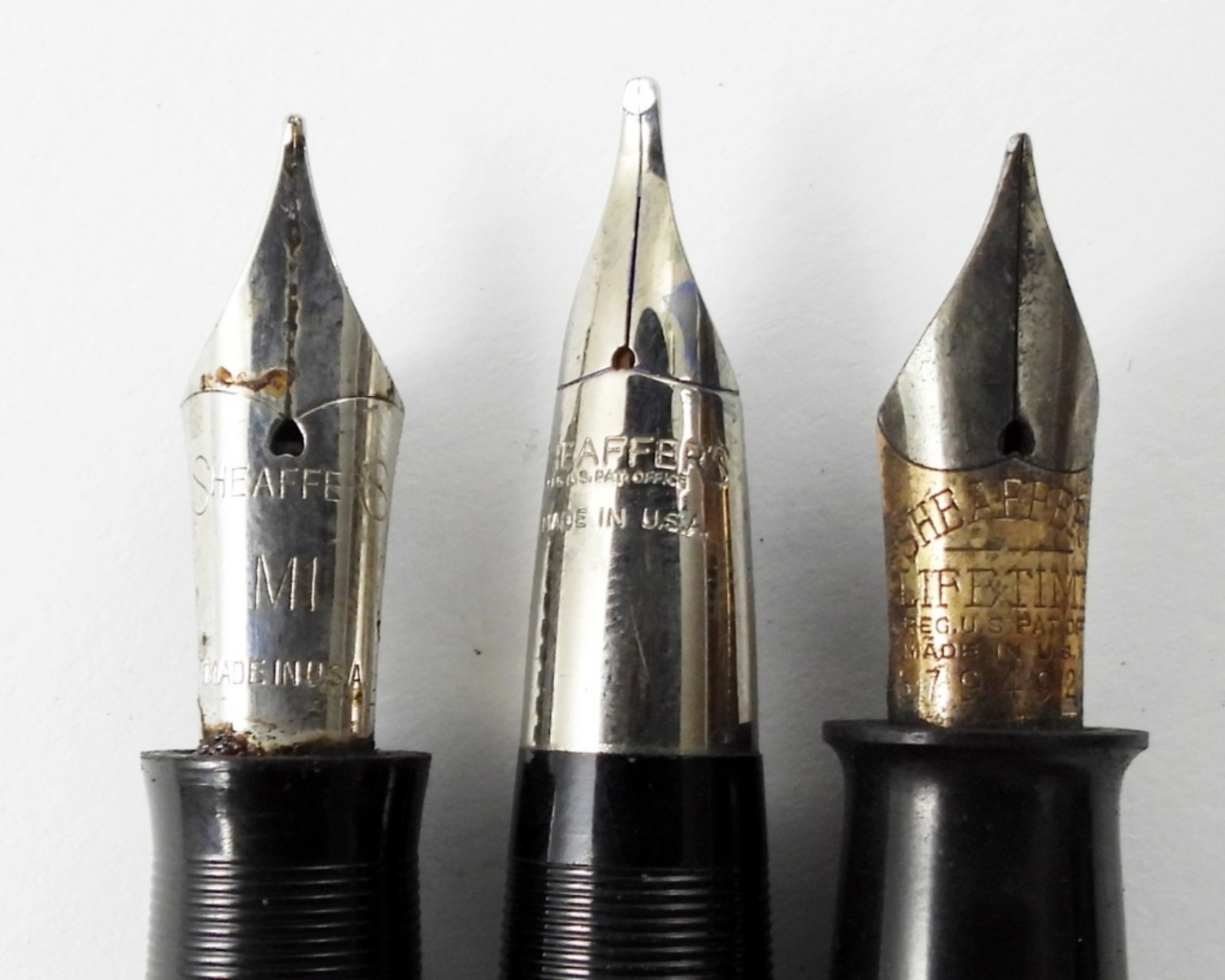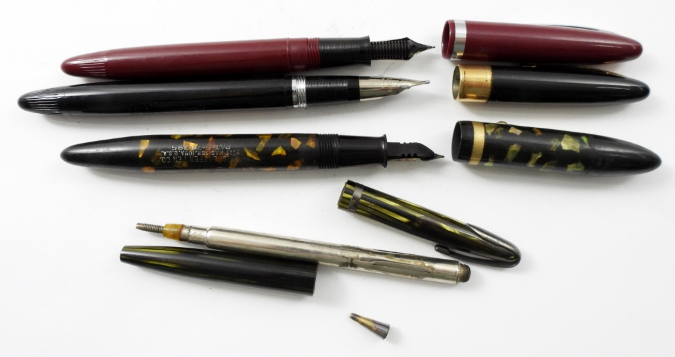 1 SHEAFFER LIFETIME FOUNTAIN PEN, LEVER FILL, UNTESTED. 1 M1 NIB FOUNTAIN PEN, BURGANDY, UNTESTED. 1 B4 FOUNTAIN PEN, BLACK, UNTESTED.1 400 MECHANICAL PENCIL, GREEN STRIPE, UNTESTED. ALL MADE IN USA.