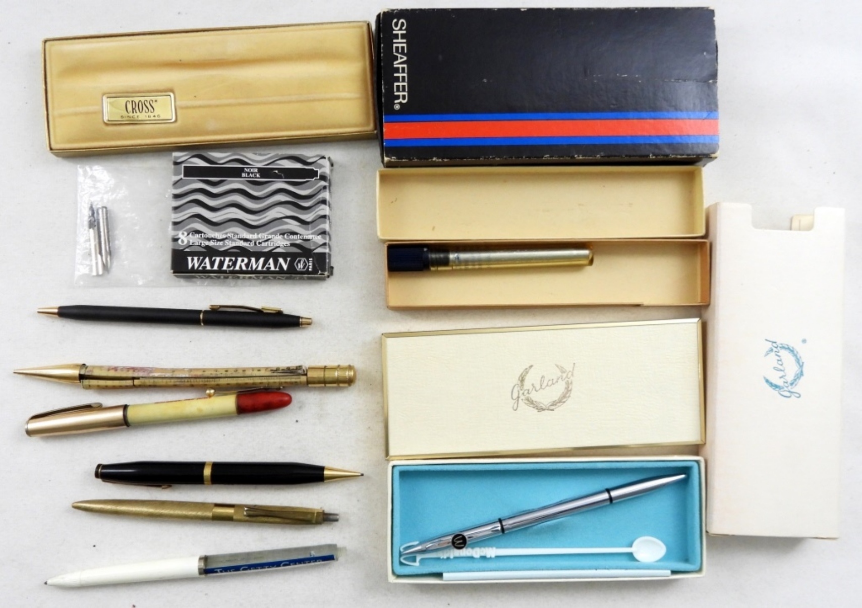 1 GARLAND MCDONALDS PROMOTIONAL BALLPOINT PEN AND PENCIL IN ORIGINAL PACKAGING, 2 VINTAGE NIBS, CROSS PEN PACKAGING (NO PEN), SHEAFFER PEN BOX (NO PEN), 8 PK WATERMAN BLACK INK CARTRIDGES (VINTAGE ORIGINAL PACKAGING), 1