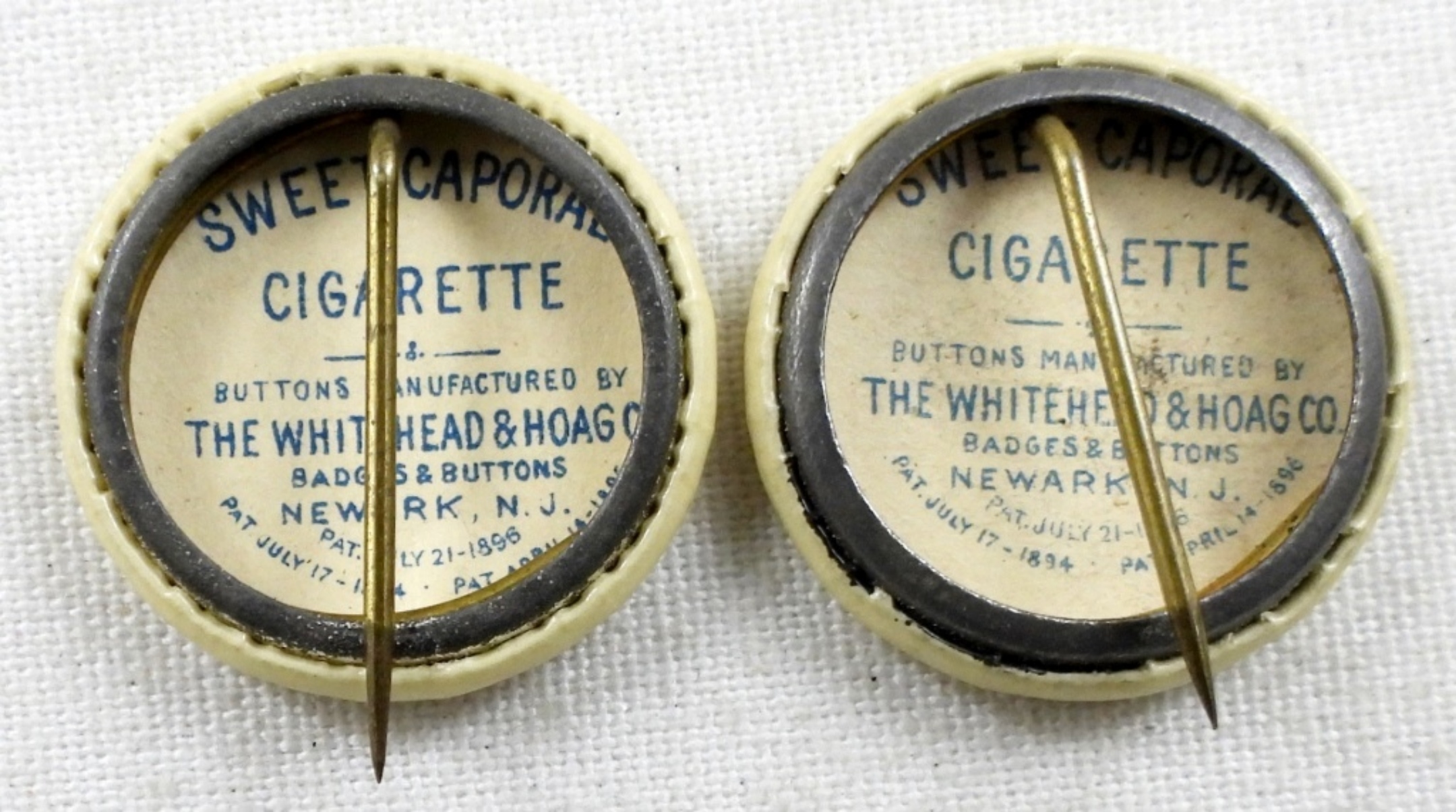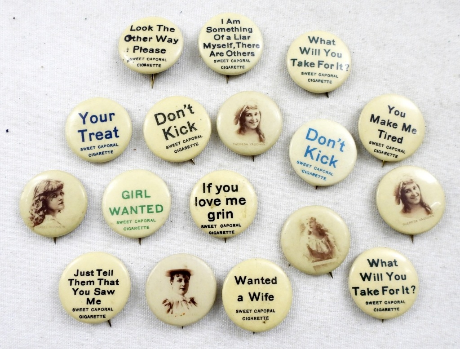 17 ASSORTED VINTAGE SWEET CAPORAL CIGARETTE COMPANY PINS–WORDS, ACTRESSES