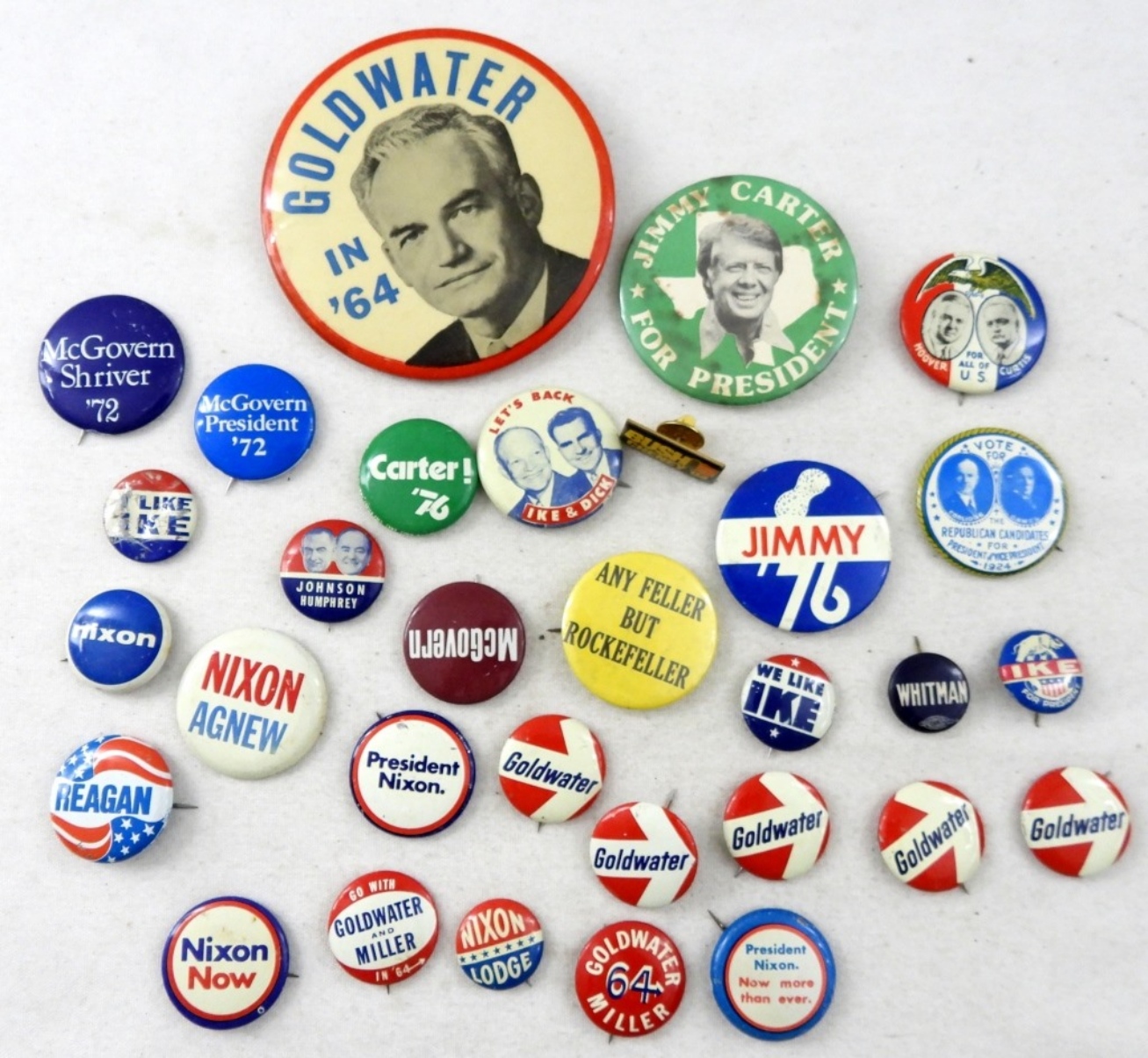 32 ASSORTED PINS: GOLDWATER 64′, CARTER 76′, MCGOVERN ’72, NIXON, REAGAN, AND MORE