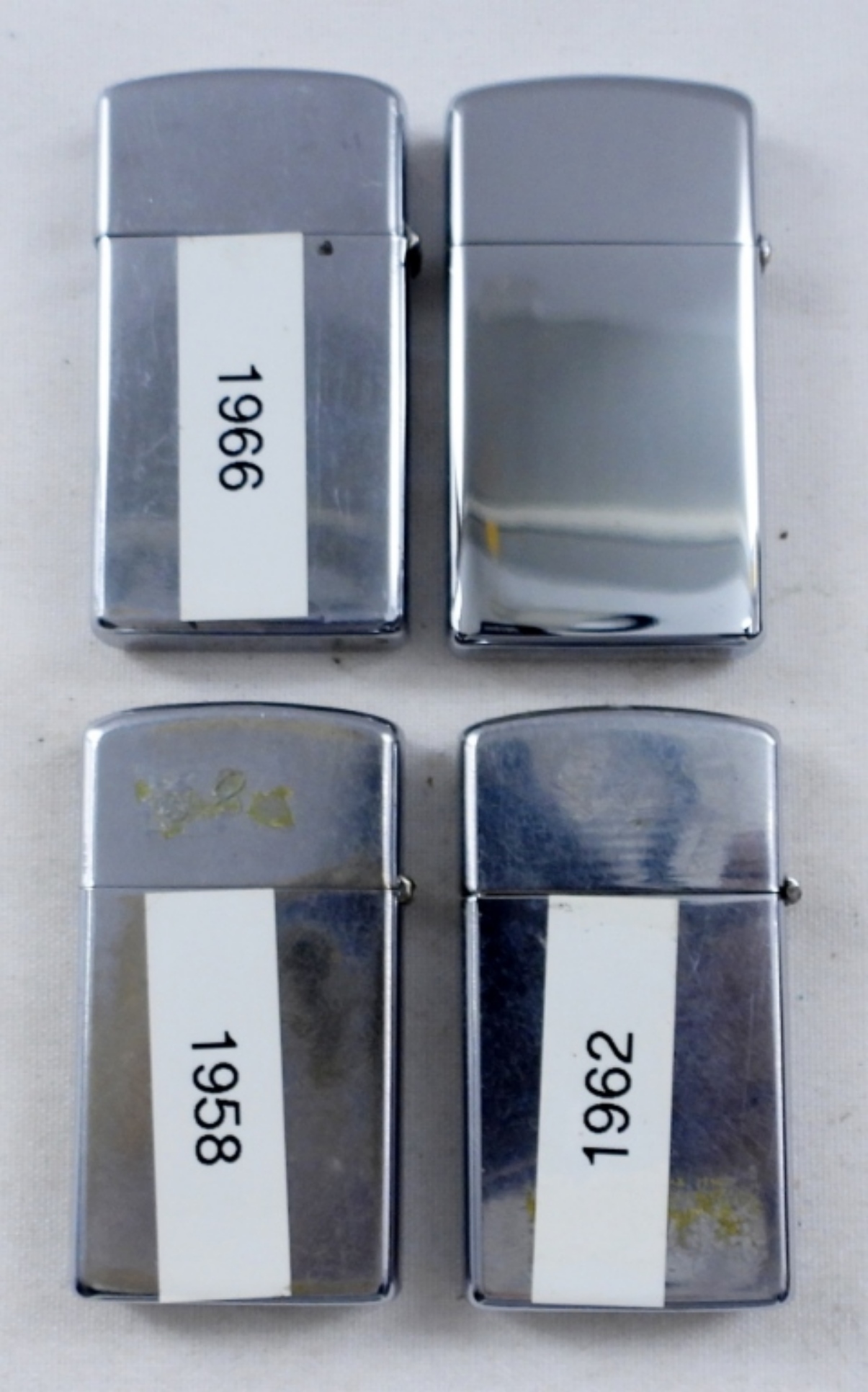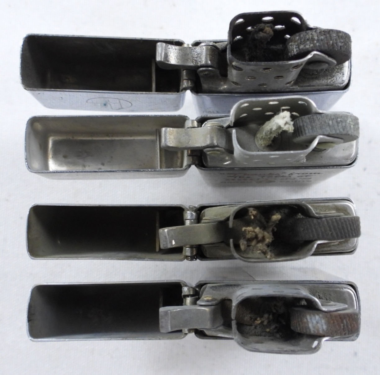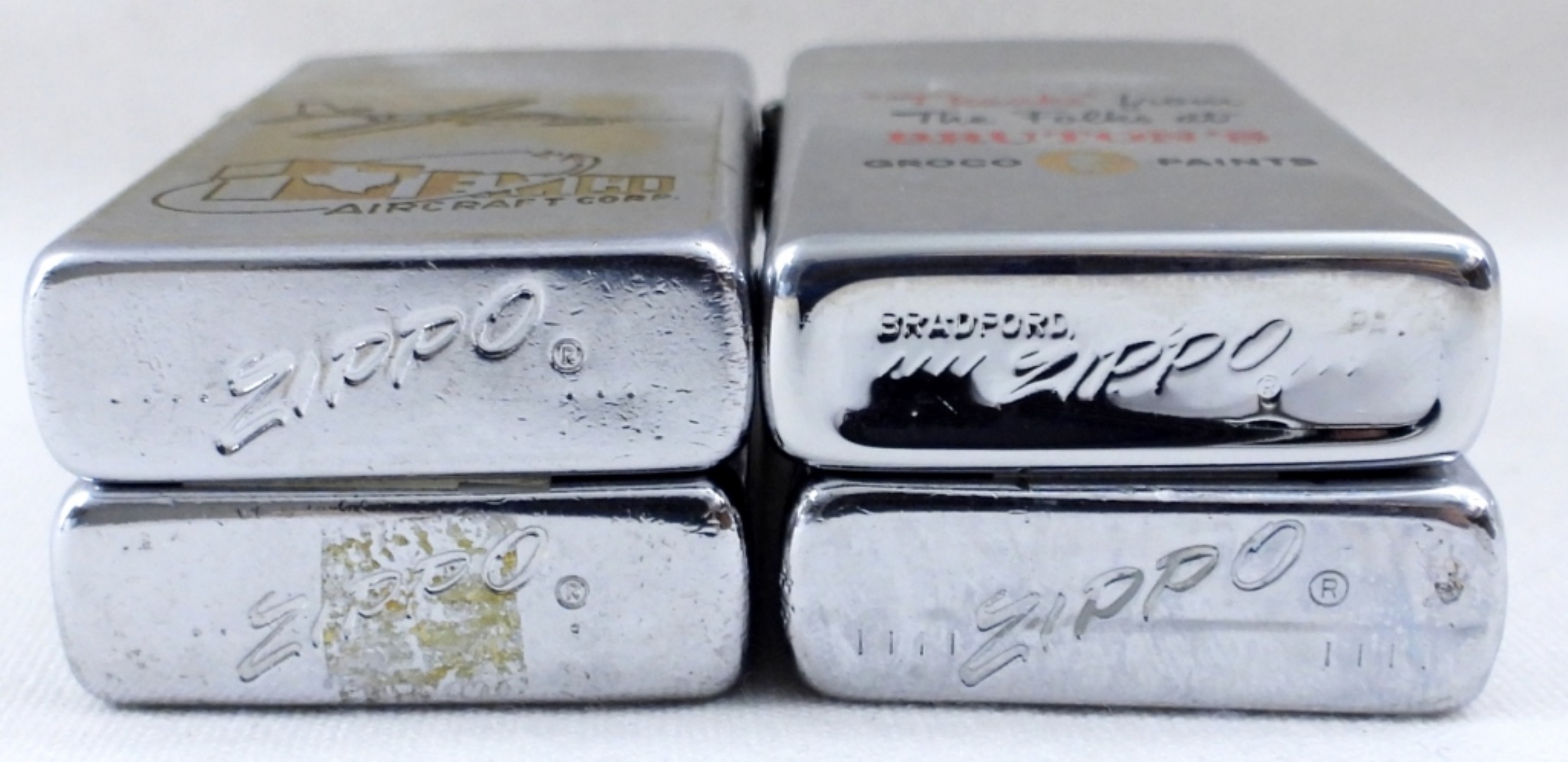 1959- TEMCO AIRCRAFT CORP ZIPPO, FIRED. 1962 GLOBAL “GVL” VAN LINES, FIRED. HALL-MARK ELECTRONICS CORP, FIRED. BRUTON’S GROCO PAINT’S ZIPPO, FIRED, COMES WITH A BOX INTACT DOES HAVE SOME WARE TO IT,)