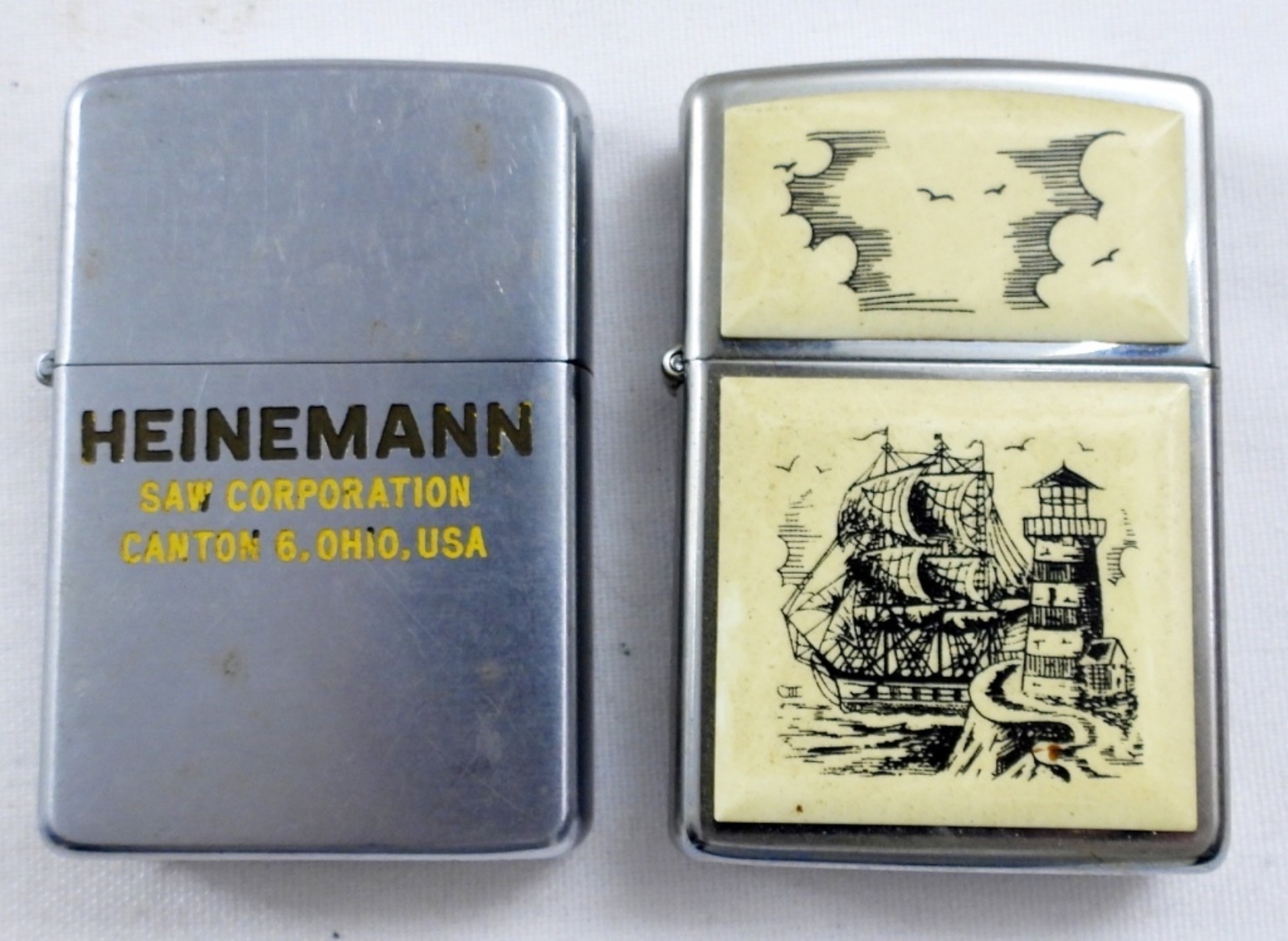 1991 VINTAGE PIRATE SHIP ZIPPO, UNFIRED. 1958 HEINEMANN SAW CORPORATION, CANTON 6, OHIO, USA, FIRED. NO BOEXES.