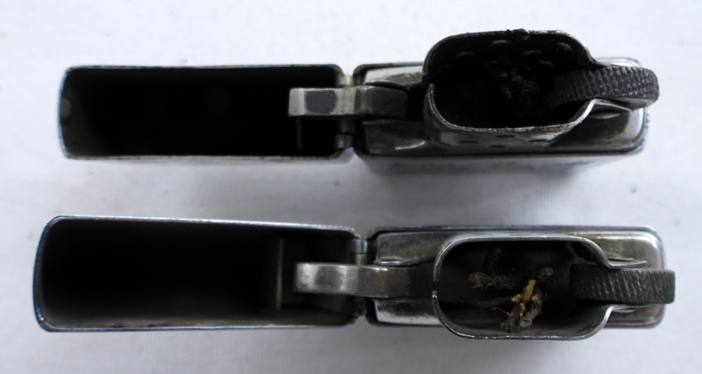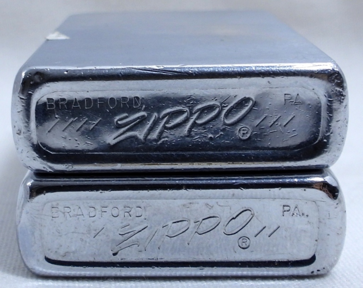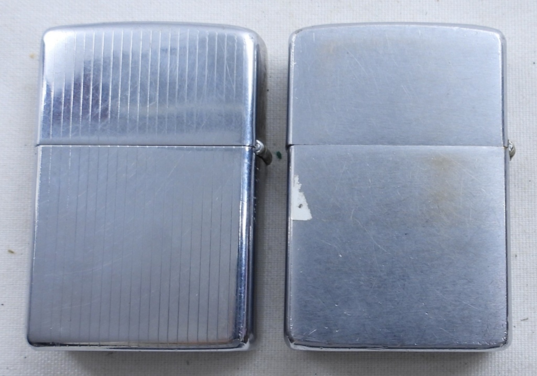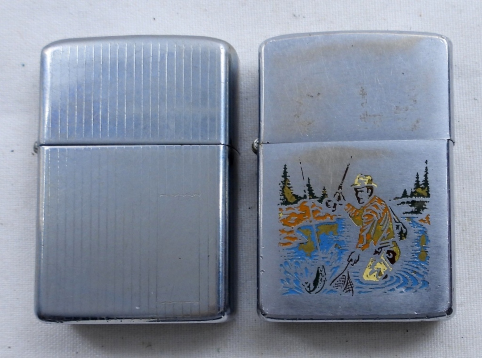 VINTAGE 1975 MAN FISHING ZIPPO, FIRED. 1979 VINTAGE ZIPPO WITH ACCENT LINES VERTICAL, FIRED.