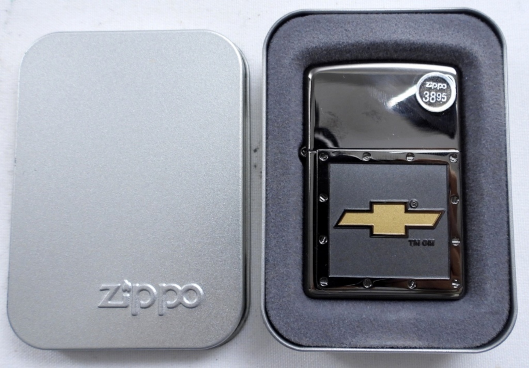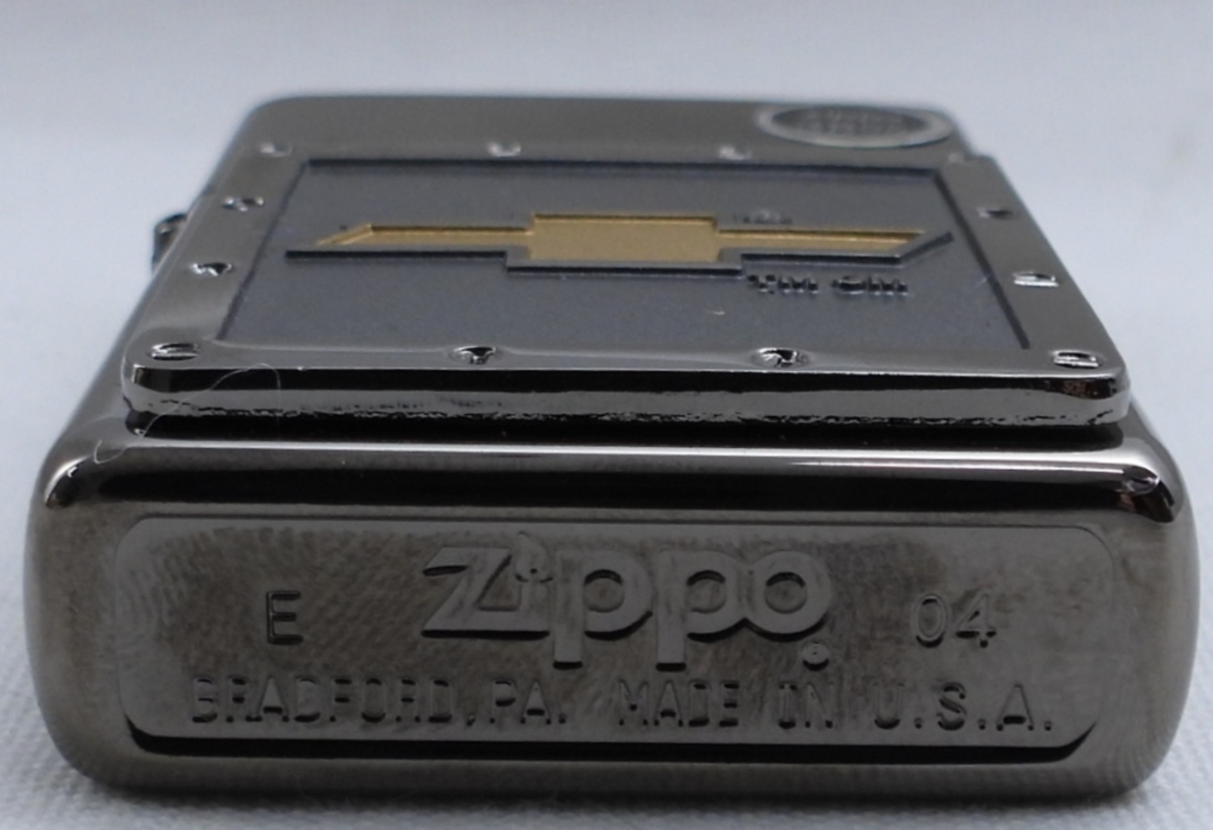 2004 CHEVY EMBLEM ZIPPO, SEALED & UNFIRED. COMES IN ZIPPO TIN, WITH CHEVROLET CARDBOARD SLEEVE (ONE CORNER HAS SOME WEAR).