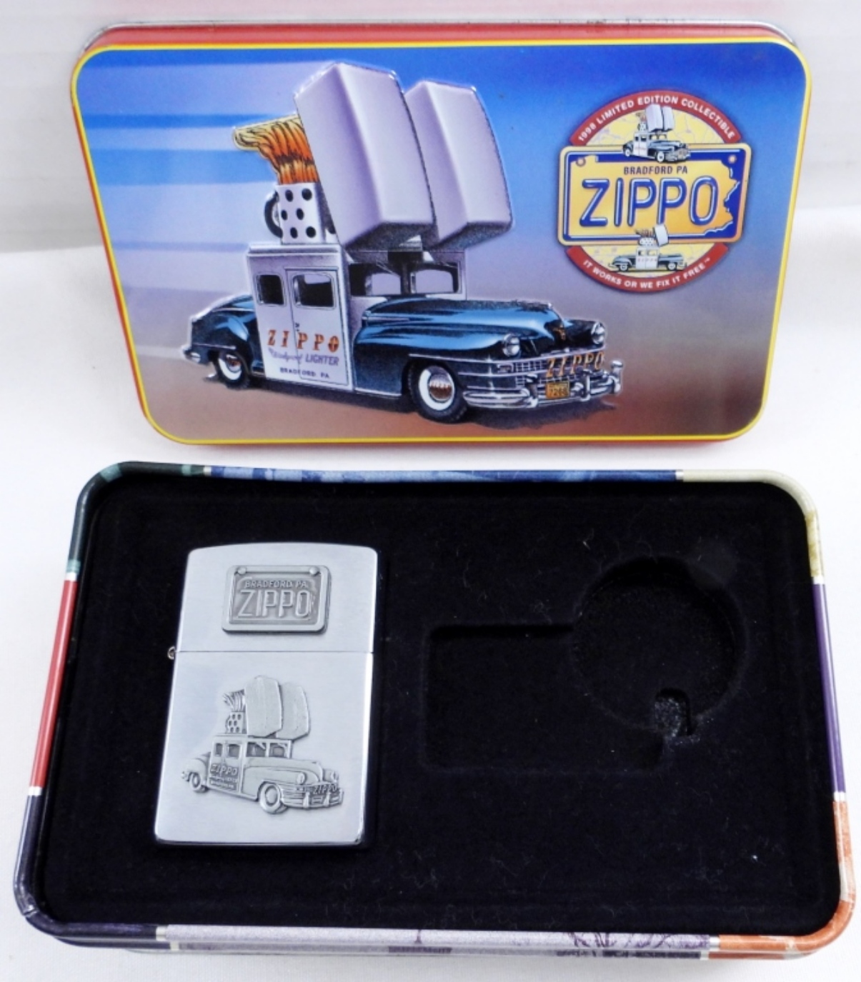1998 ZIPPO CAR LIGHTER- COMES WITH THE TIN, MISSING KEY CHAIN, UNFIRED.