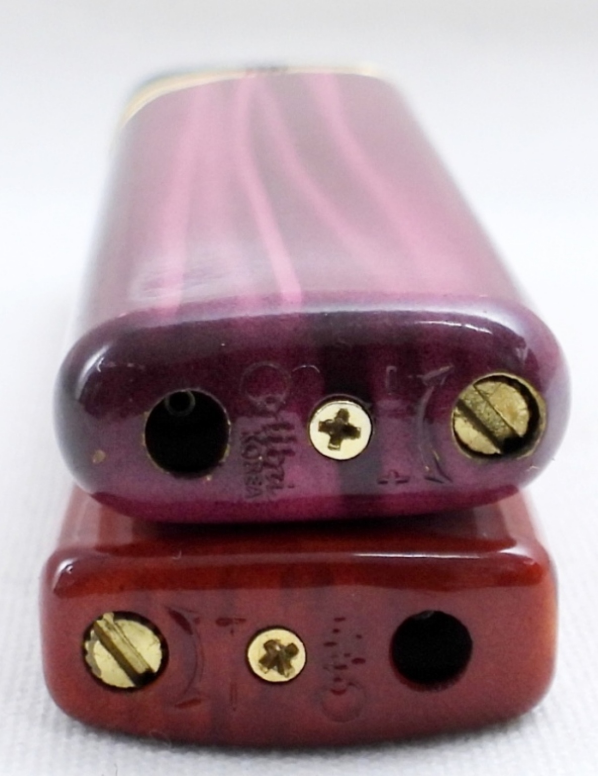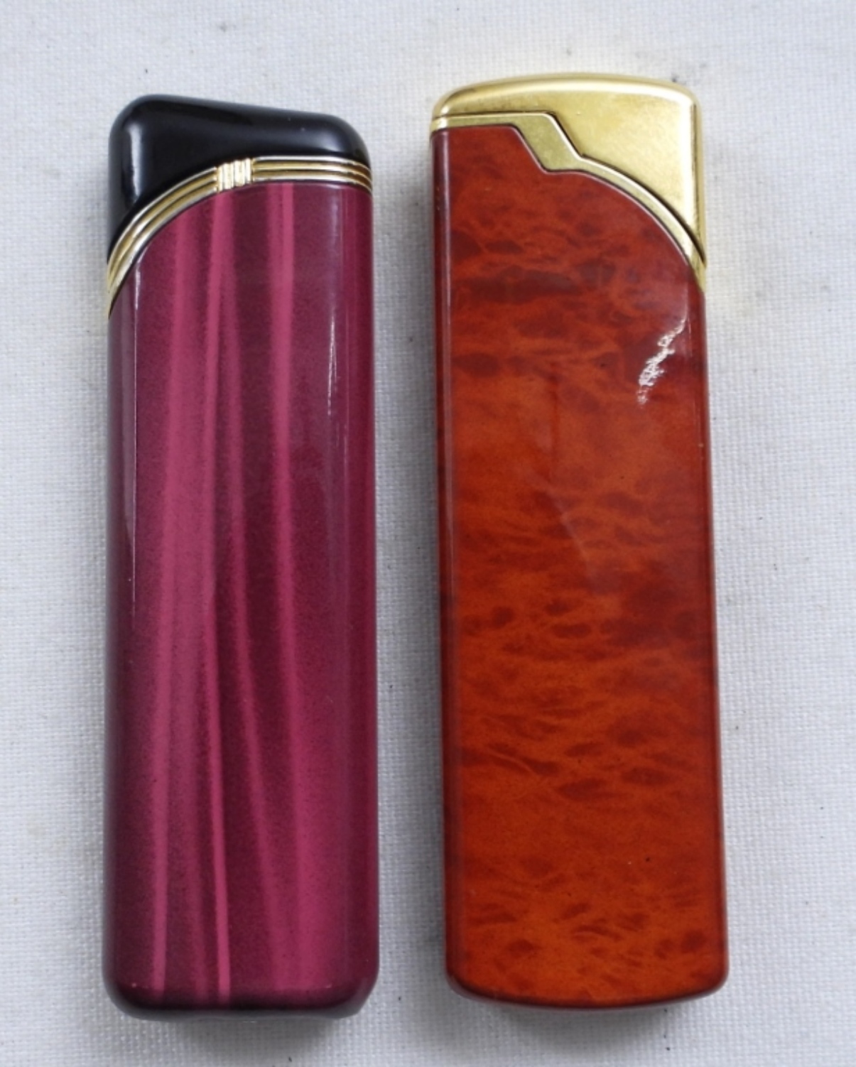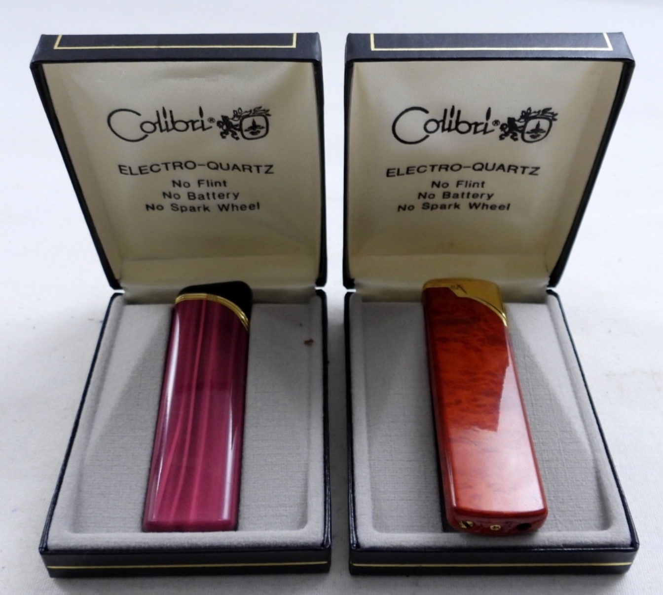 2 VINTAGE COLIBRI ELECTRO-QUARTZ LIGHTERS – PINK & ORANGE RED TONED. BOTH HAVE BEEN FIRED. BOTH COME WITH THEIR OWN COLIBRI BOXES.