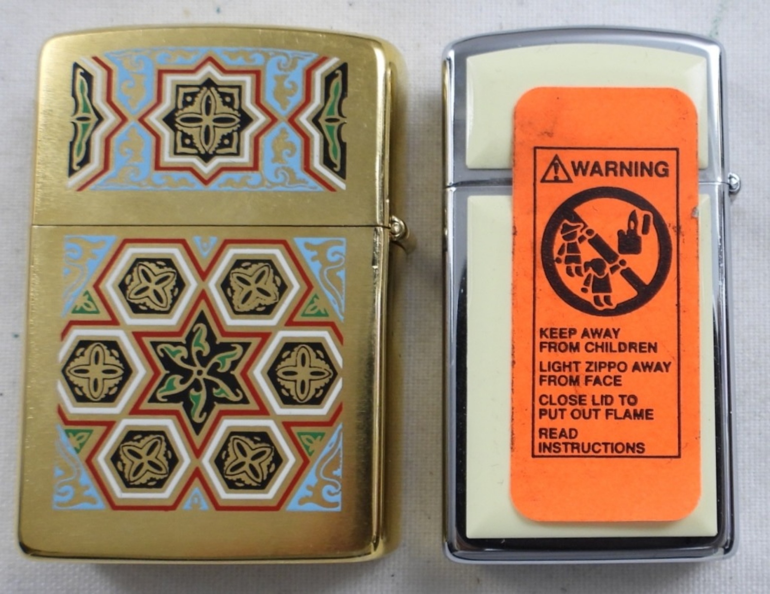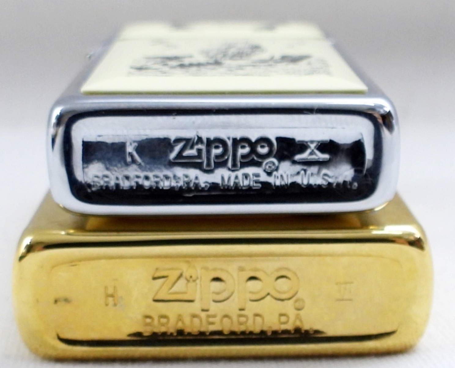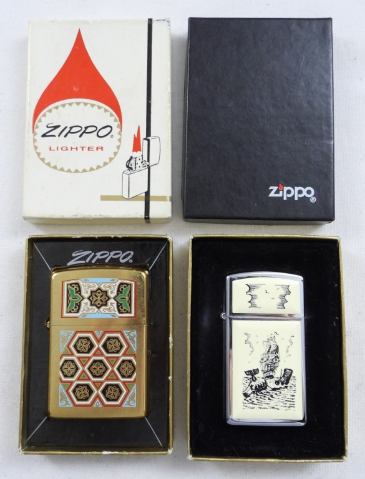 VINTAGE 1991 SCRIMSHAW WHALE SLIM ZIPPO, SEALED, COMES IN ZIPPO BOX. 1990 TOLEDO OCTASTAR ZIPPO, DESIGN ON BOTH SIDES UNFIRED, COMES IN ZIPPO BOX.
