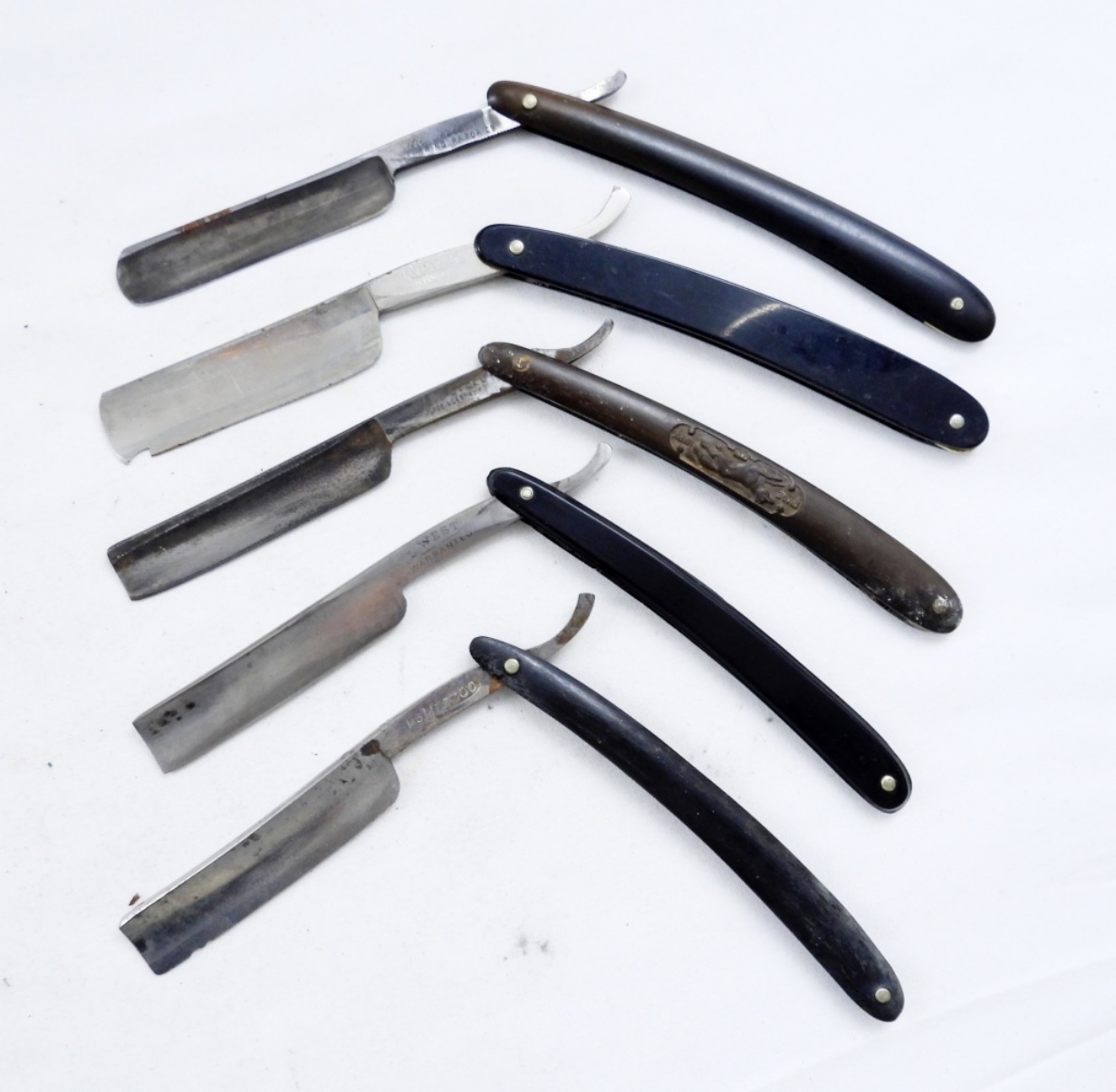 5 ASSORTED BLACK HANDLE RAZORS, DIFFERENT BRANDS AND VARIOUS CONDITIONS
