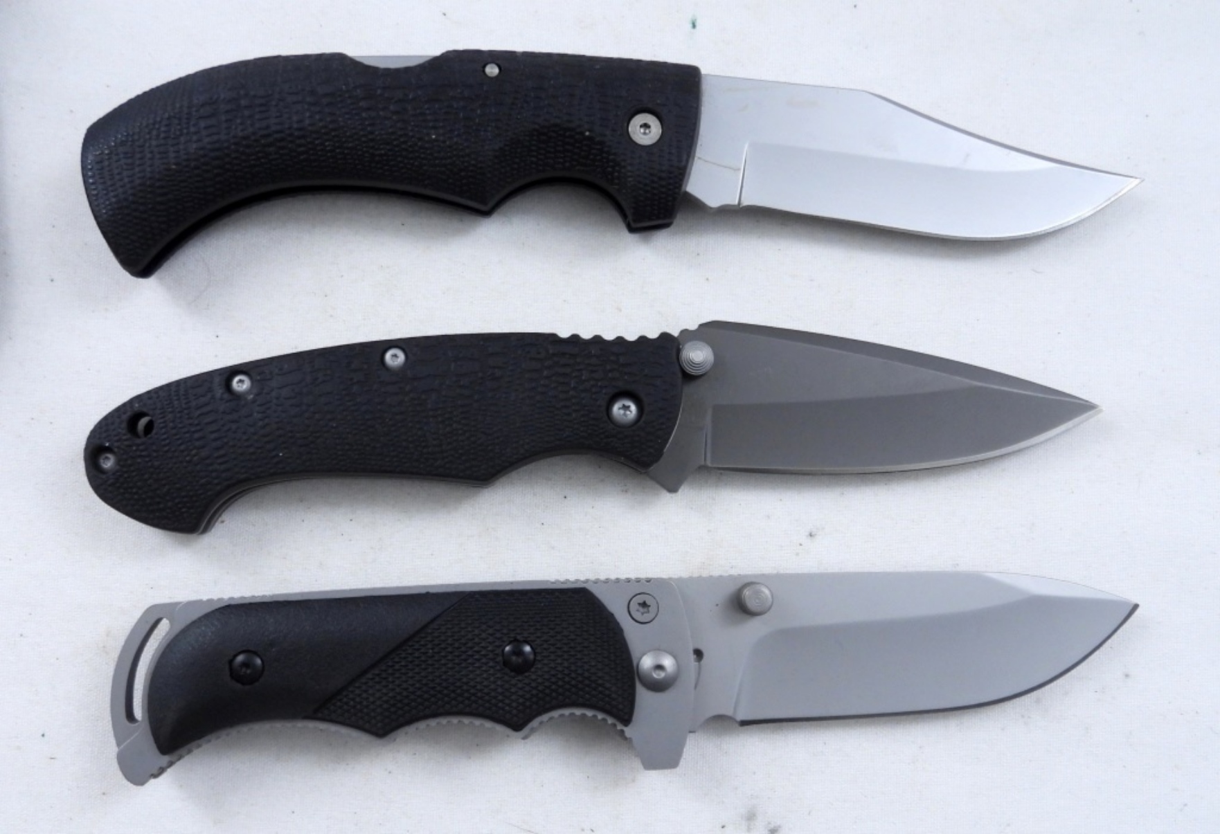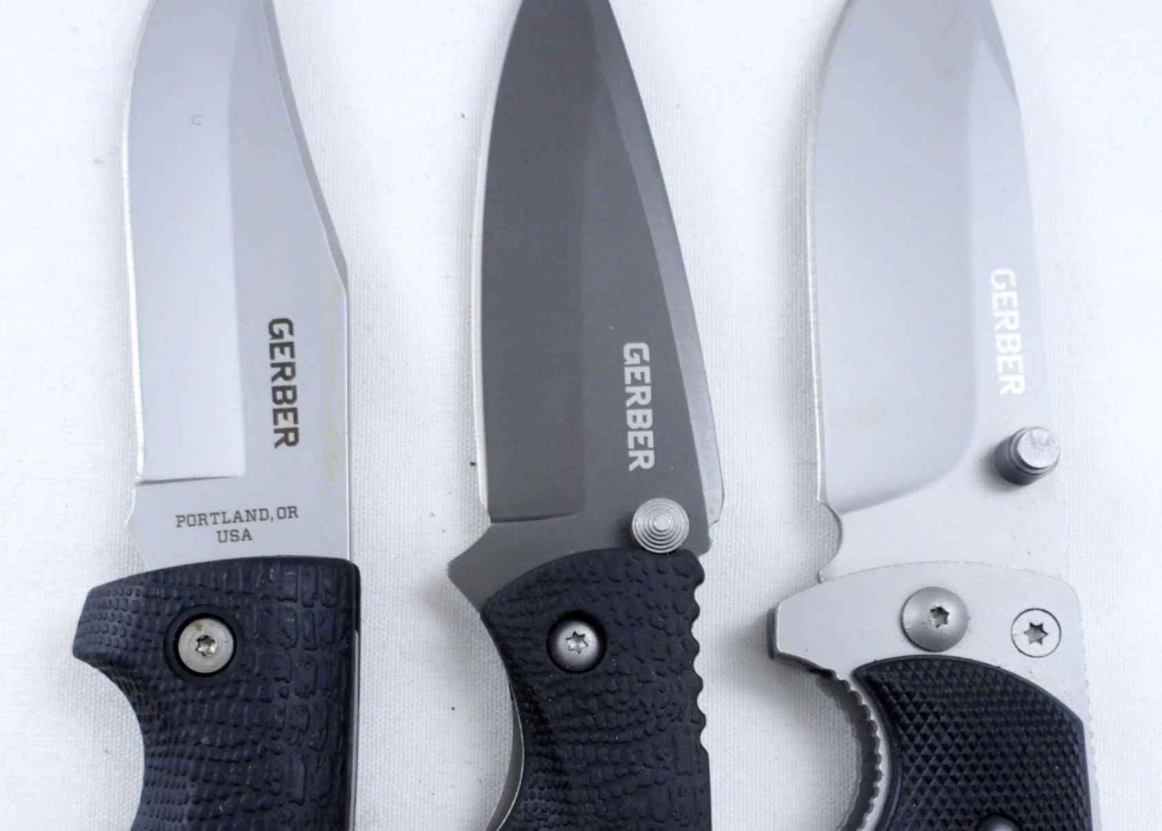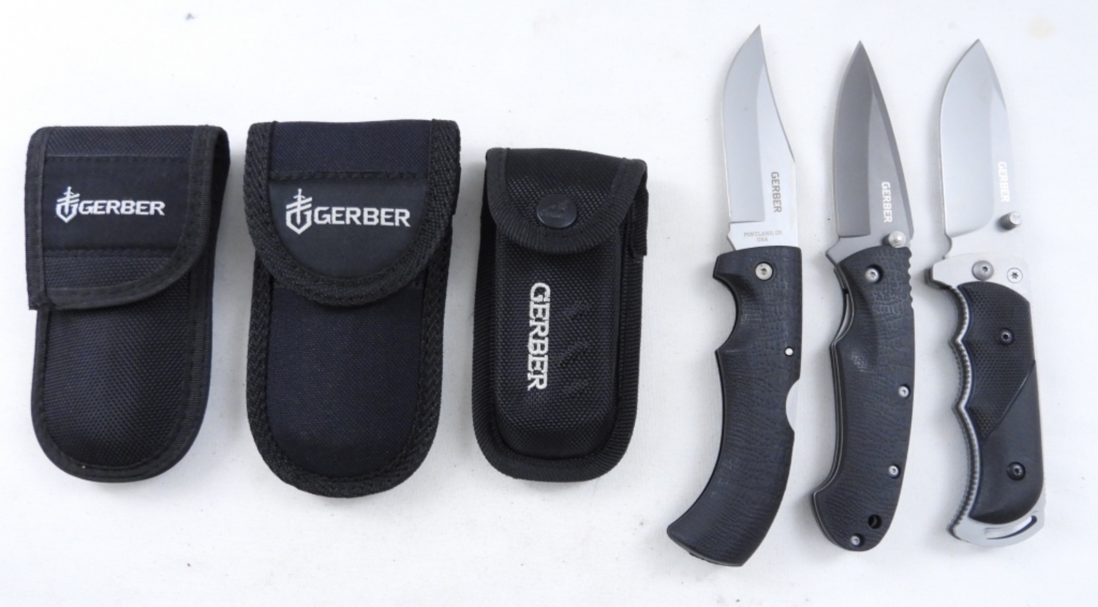 3 GERBER FOLDING KNIVES ALL IN BLACK SHEATHS, BID NOW!