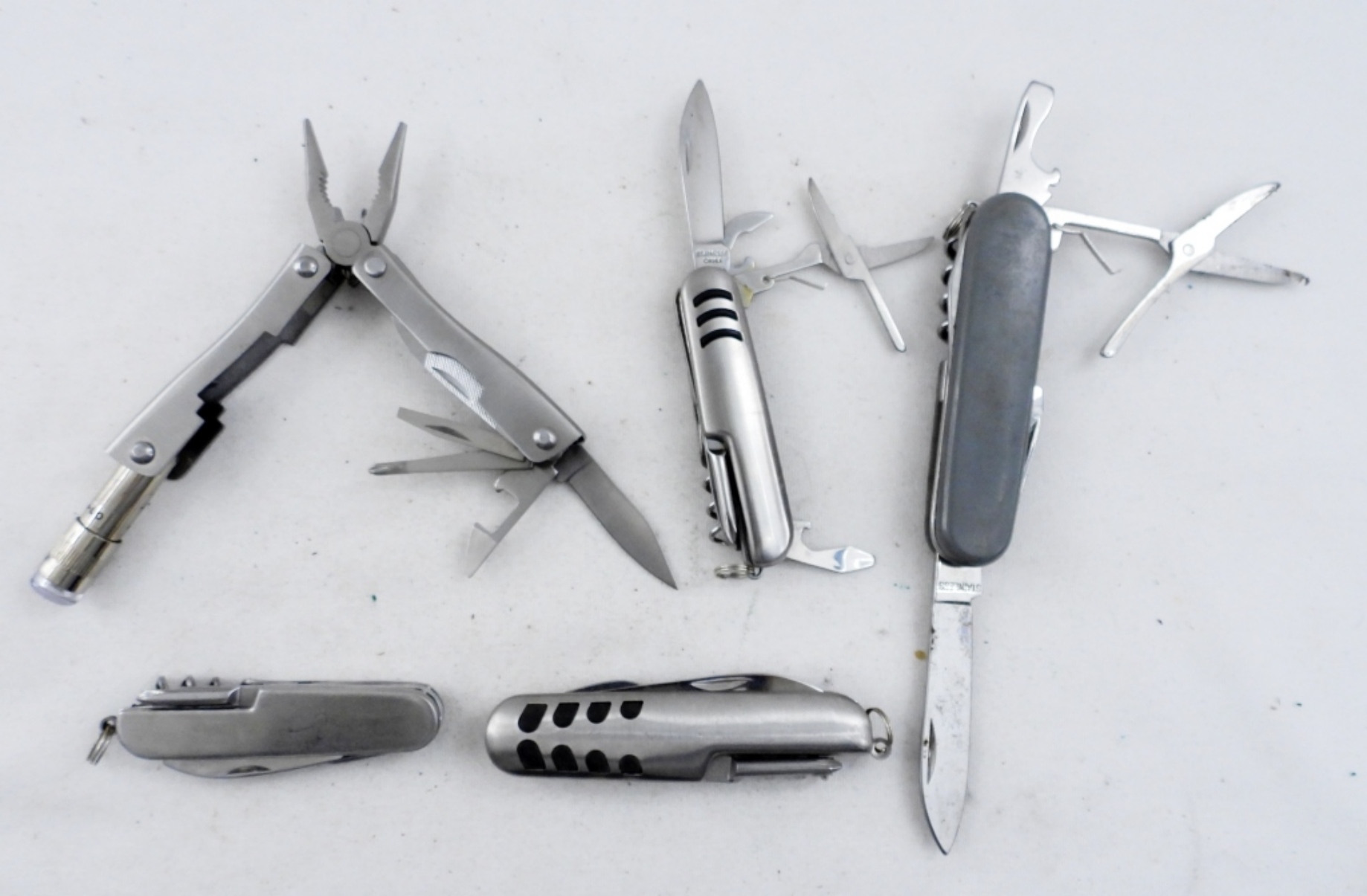5 SILVER TONED MULTI TOOL SETS, ONE HAS A SET OF PLYERS AS WELL. ALL PRE OWNED.