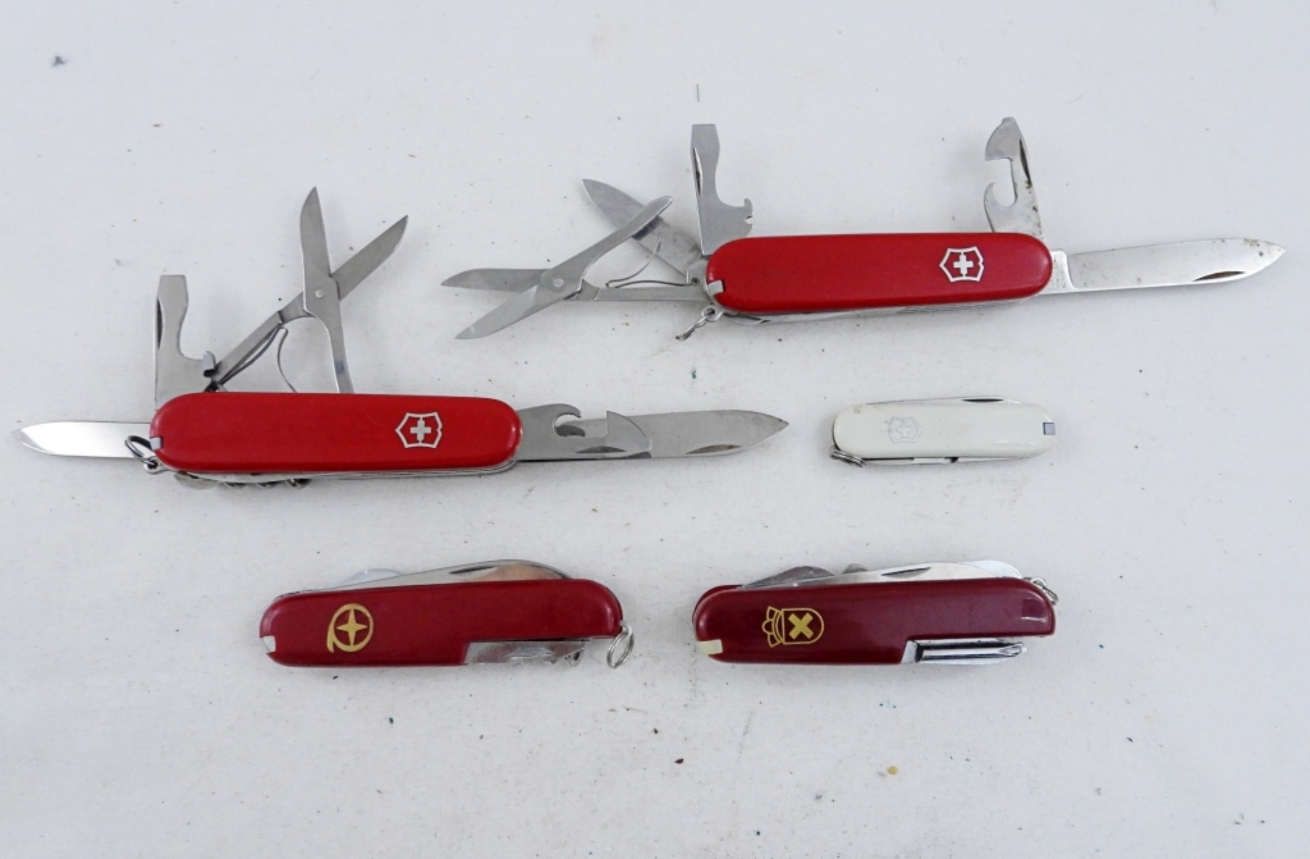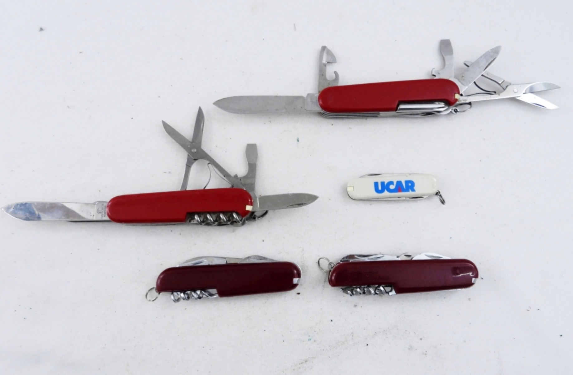 5 SWISS ARMY KNIVES- 4 LARGE RED SWISS ARMY KNIVES, 1 SMALL WHITE SWISS ARMY KNIFE. ALL IN GOOD CONDITION. ALL PRE OWNED.