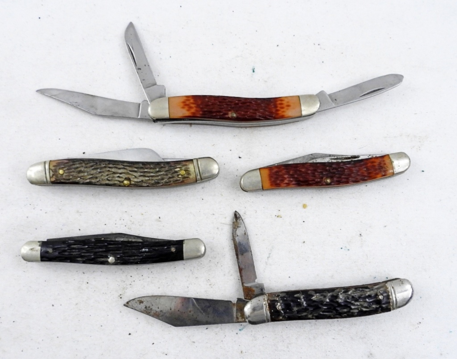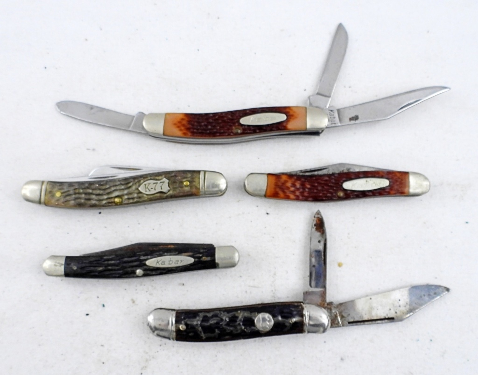 3- KABAR 3 BLADED POCKET KNIVES, 1- IMPERIAL POCKET KNIFE, 1- SCHRADE 2 BLADED POCKET KNIFE. ALL IN GOOD CONDITION, BUT ARE PRE OWNED,
