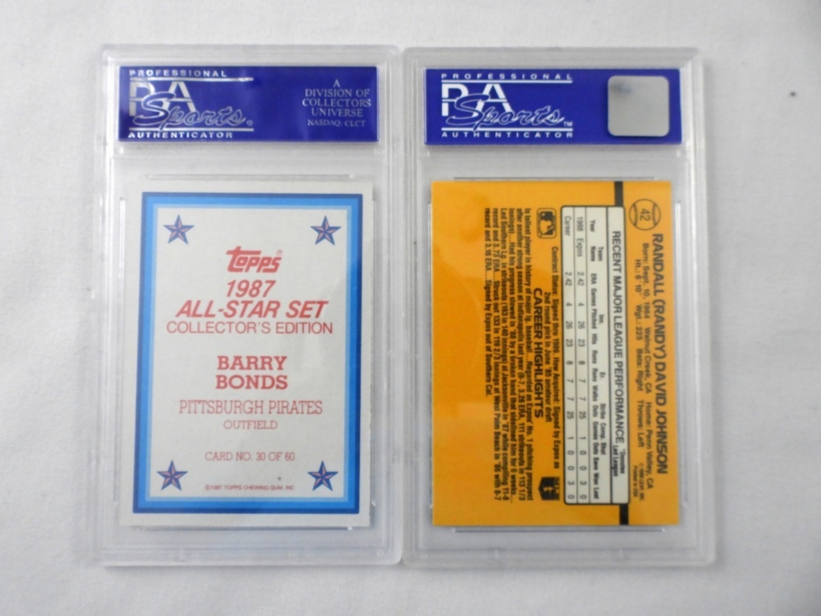 1987 TOPPS BARRY BONDS GEM MT 10, 1989 DONRUSS RANDY JOHNSON NM-MT 8, BOTH GRADED BY PSA