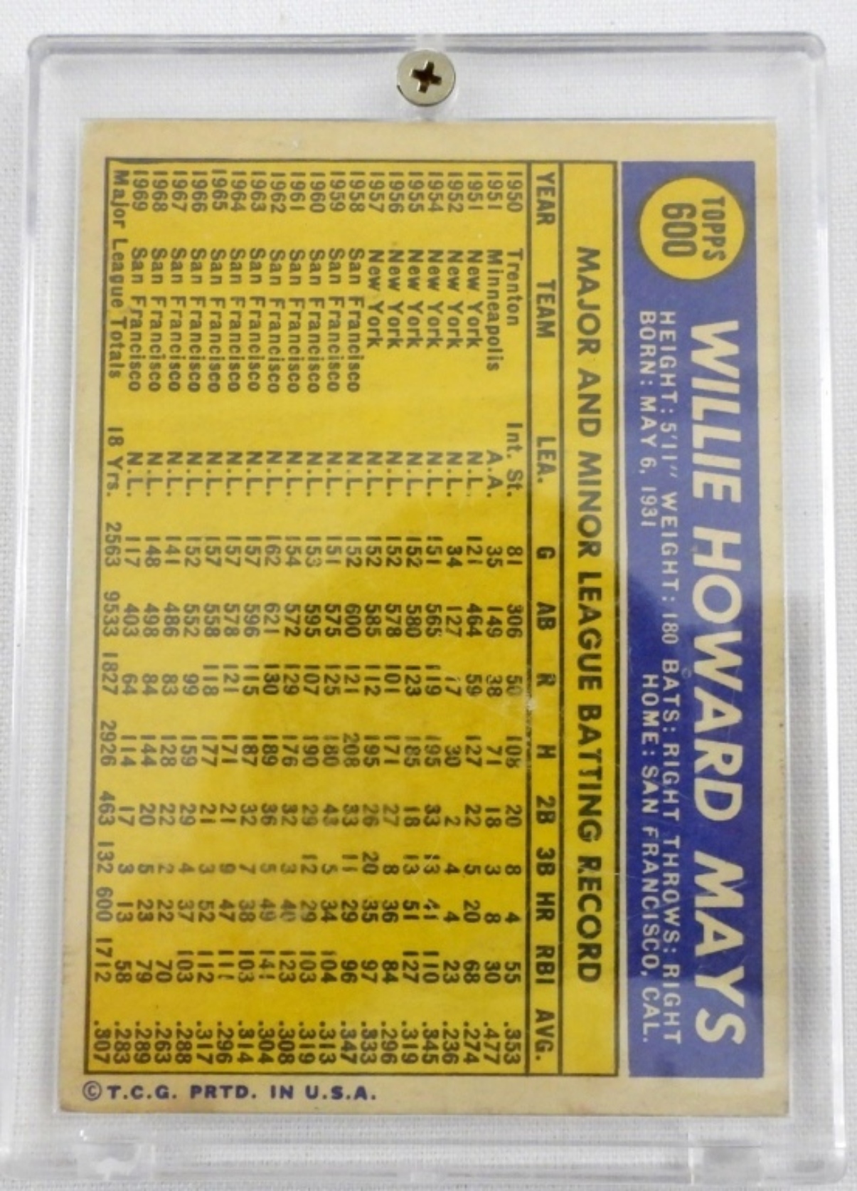 VGEX TOPPS #600 WILLIE MAYS BASEBALL CARD, BID NOW!