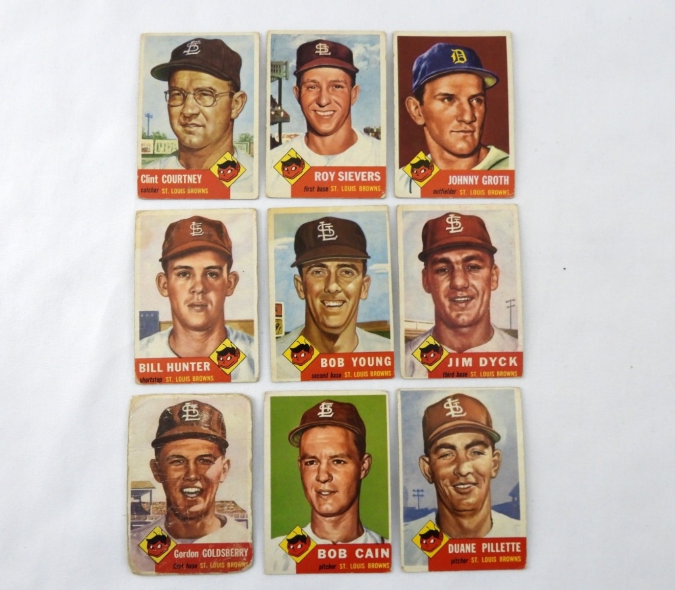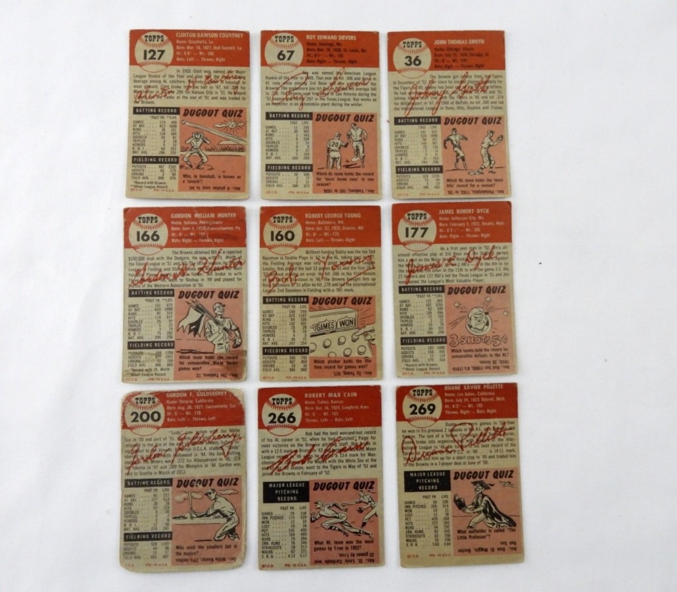 1953 ST LOUIS BROWN TOPPS CARD LOT: 36, 67, 127, 160, 166, 177, 269, 266, 200, VG CREASING ON SOME CARDS