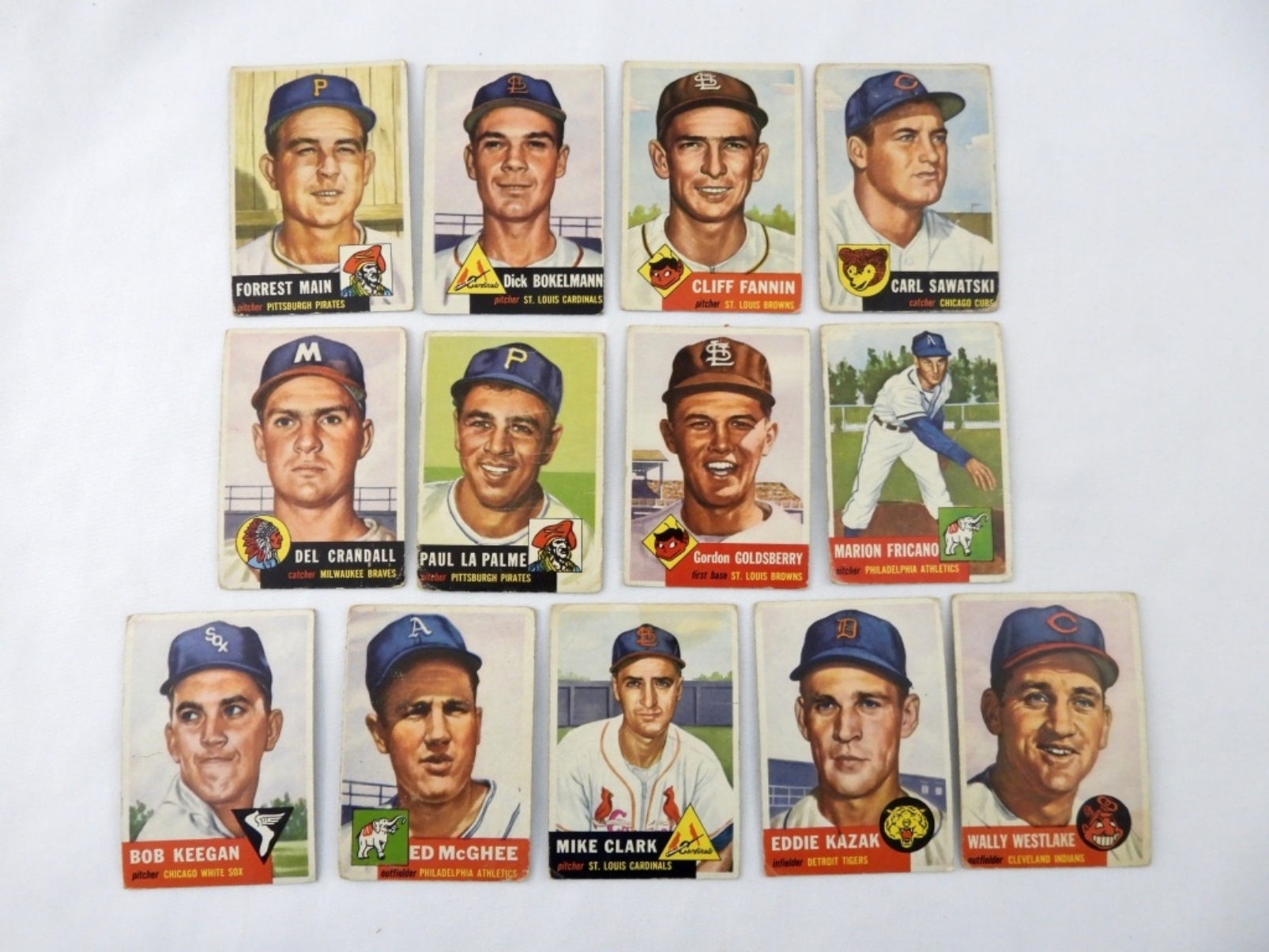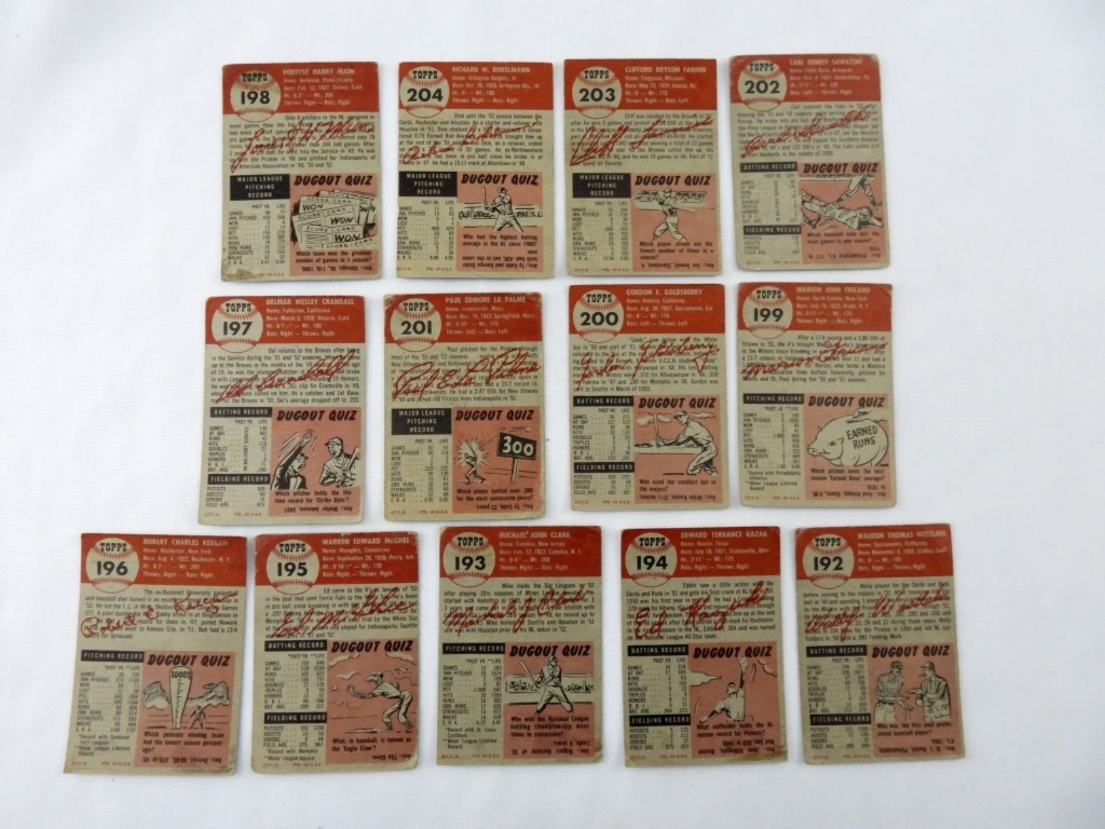 1953 CARD LOT TOPPS NUMBERS 192-204, VG, SOME CARDS ARE CREASED