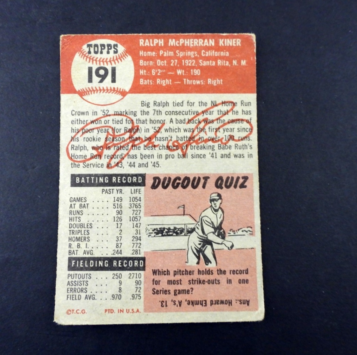 1953 RALPH KINER TOPPS NO 191, VG-VGEX.