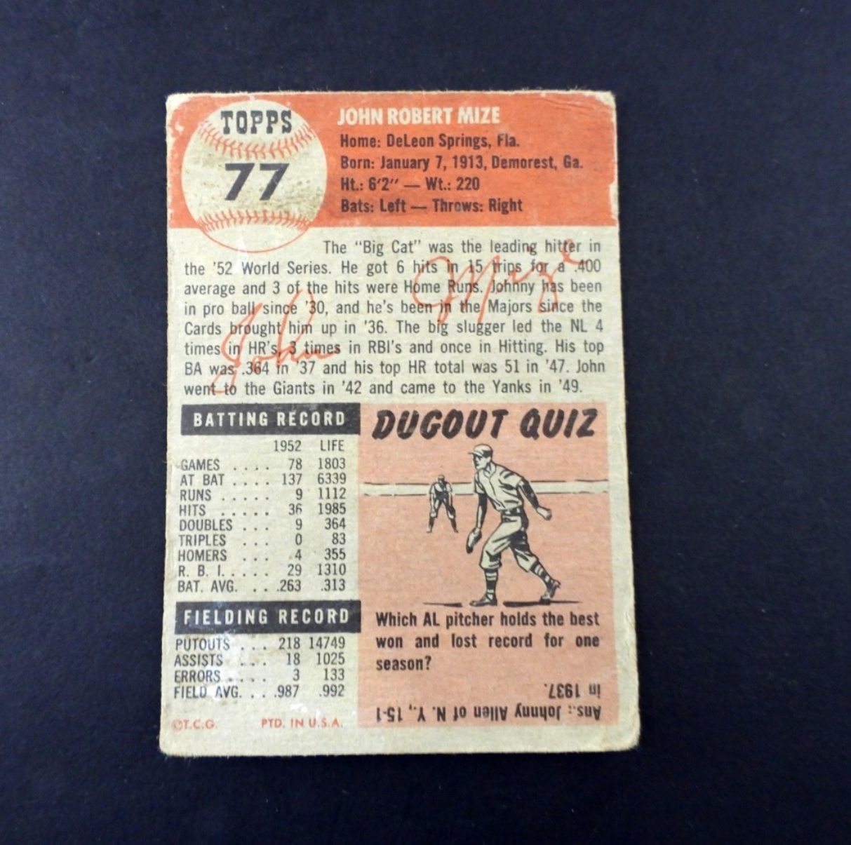 1953 JOHN MIZE TOPPS NO 77VG-VGEX.