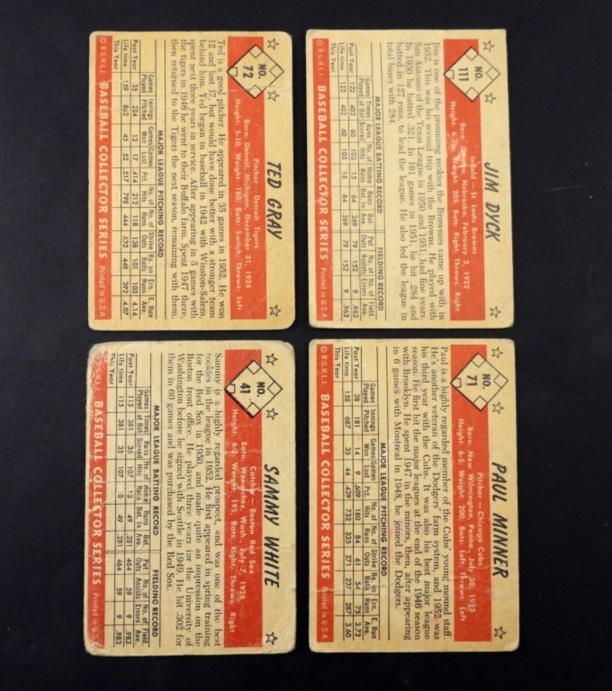 CARDS SHOW WEAR AND CREASING, CARD LOT: JIM DYCK 111, TED GRAY 72, PAUL MINNER 71, SAMMY WHITE 41.