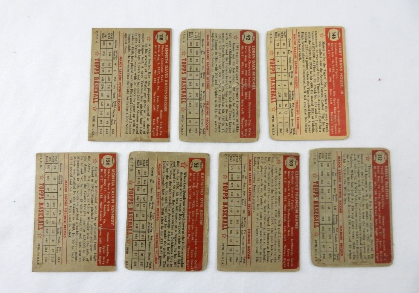 TOPPS 1952 CARDS: FRANK HOUSE 146, MONTE KENNEDY 124, KEN RAFFENSBERGER 118, HENRY MAJESKI 112, CLIFF MAPES 103, DALE MITCHELL 92, RAY OONE 55, VG–WORN CARDS WITH CREASING