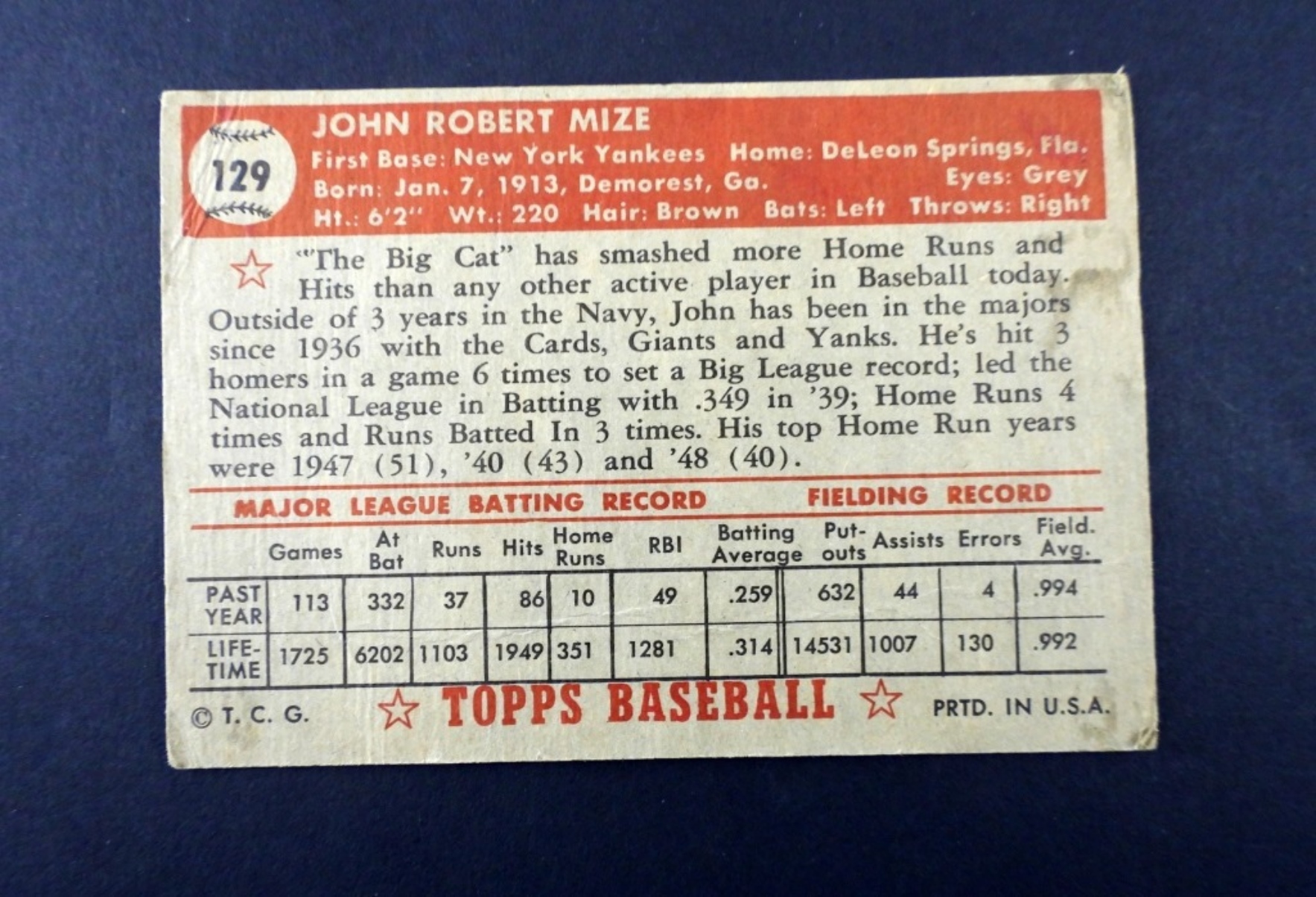 TOPPS 1952 JOHNNY MIZE NO 129, VG (SLIGHT CREASING ON CARD) BID NOW!