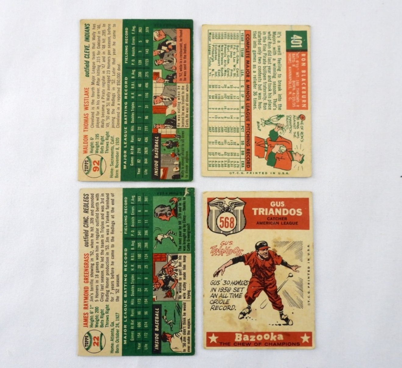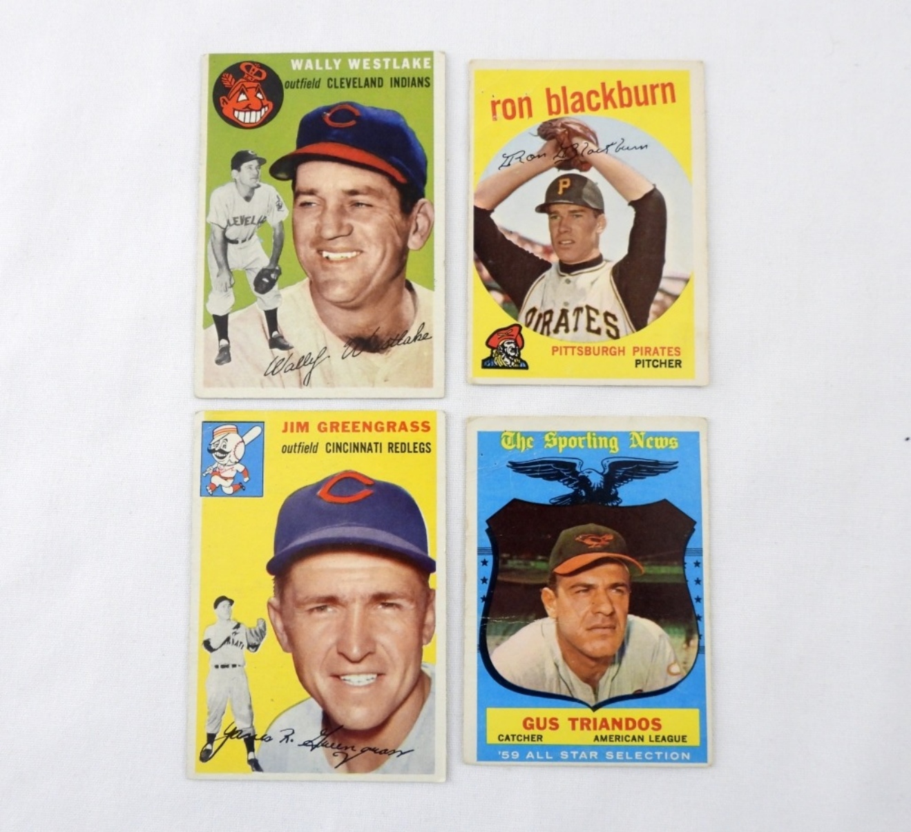 VINTAGE TOPPS CARDS 1959 RON BLACKBURN AND GUS TRIANDOS AND 1954 WALLY WESTLAKE AND JIM GREENGRASS VG – VGEX CONDITIONS, SLIGHT CREASING ON SOME CARDS