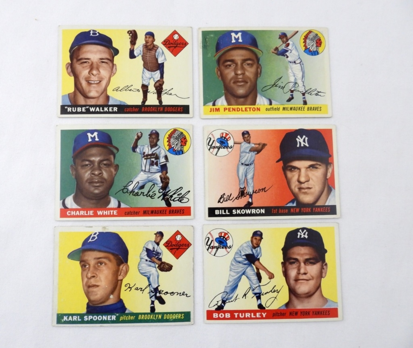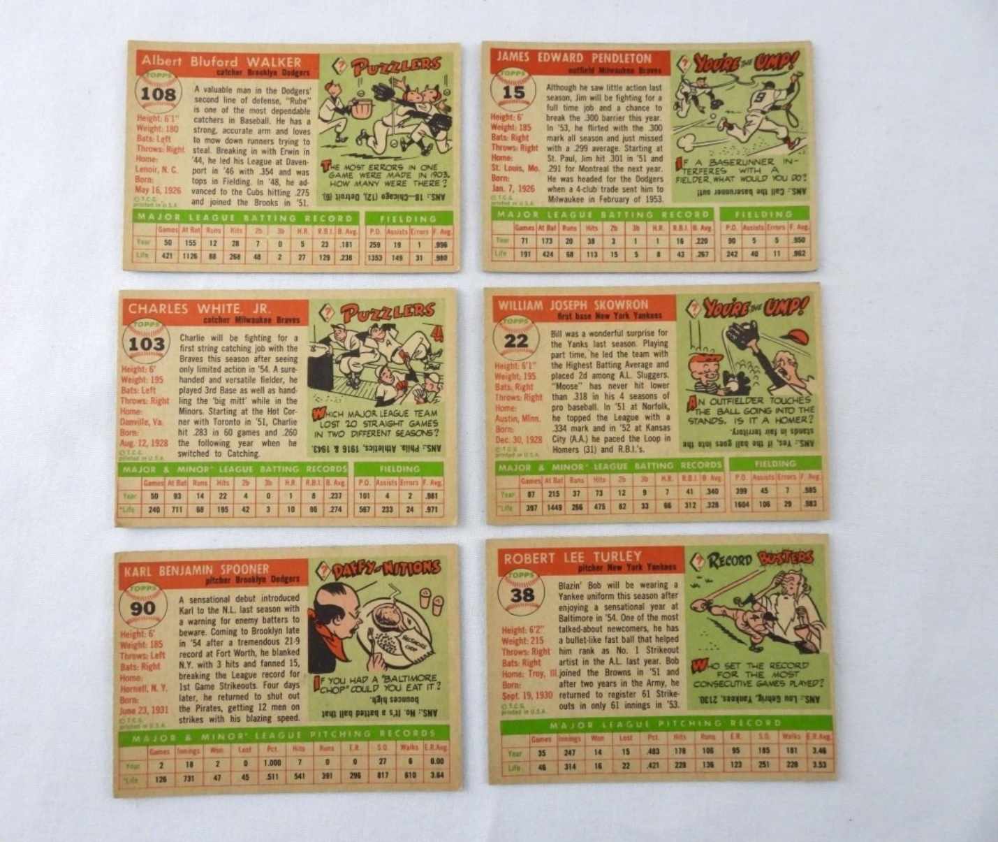 6 1955 VGEX TOPPS CARDS: BOB TURLEY 38, BILL SKOWRON 22, HIM PENDLETON 15, CHARLIE WHITE 103, KARL SPOONER 90, RUBE WALKER 108.