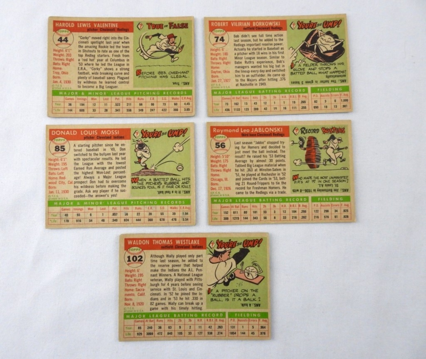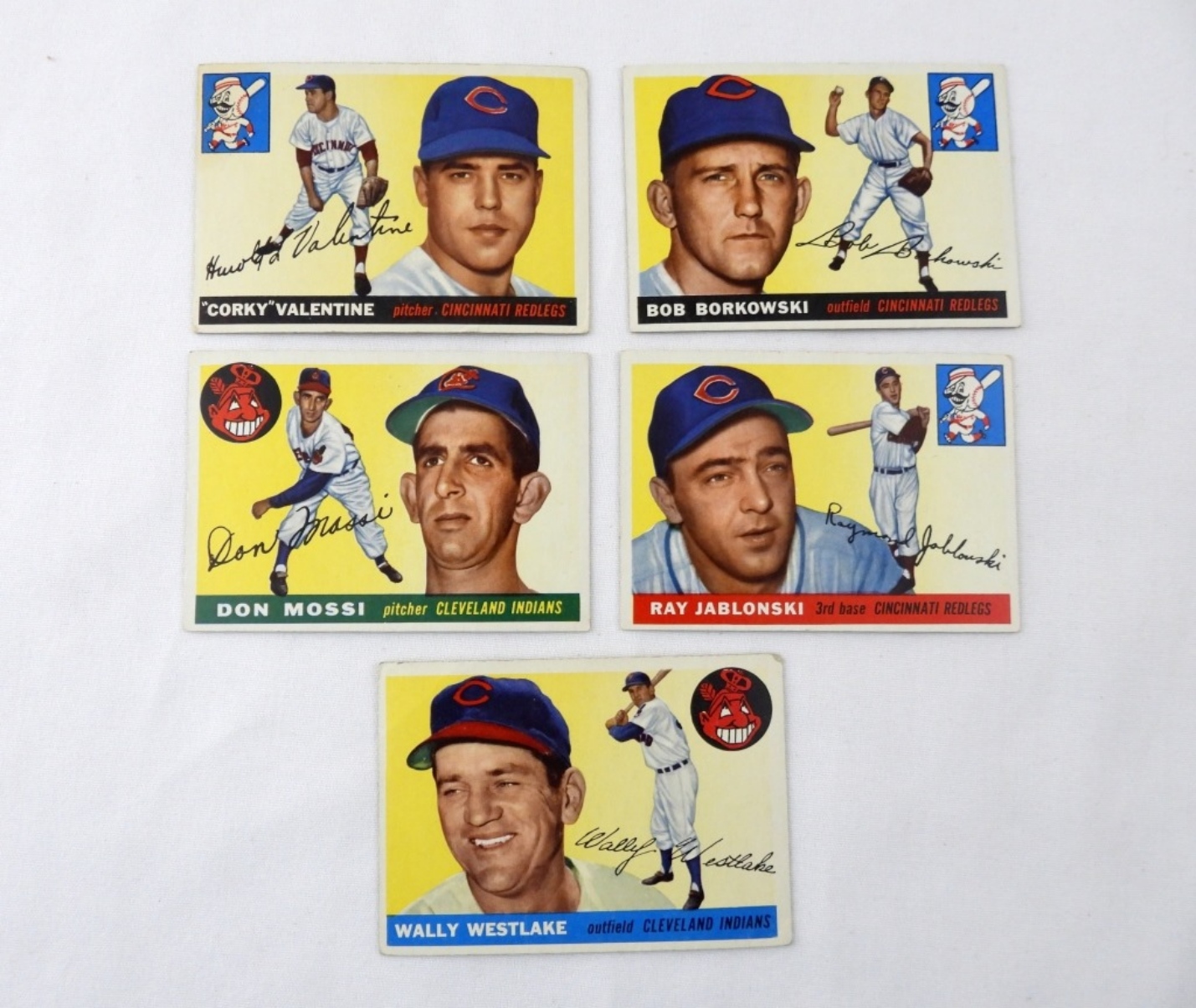 5 1955 TOPPS VGEX CARDS: RAY JABLONSKI 56, BOB BORKOWSKI 74, CORKY VALENTINE 44, WALLY WESTLAKE 102, DON MOSSI 85