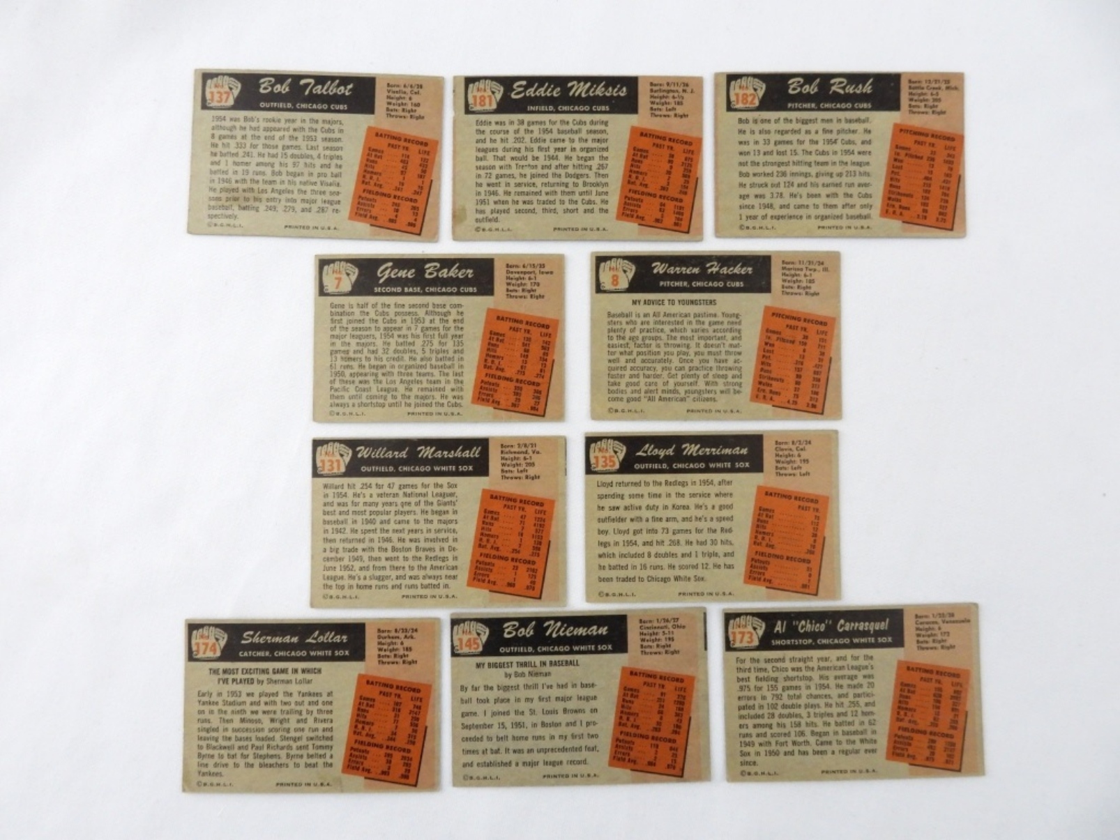 10 1955 BOWMAN VGEX WHITE SOX: 174, 173, 145, 135, 131 AND CUBS: 8, 7, 182, 181, 137.