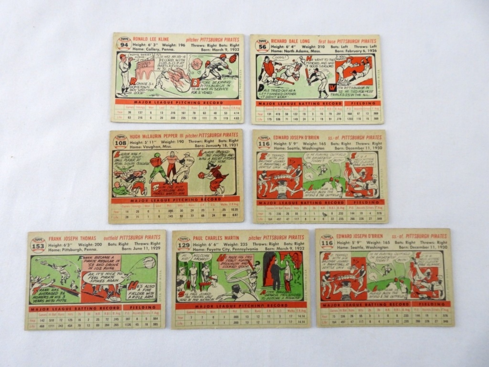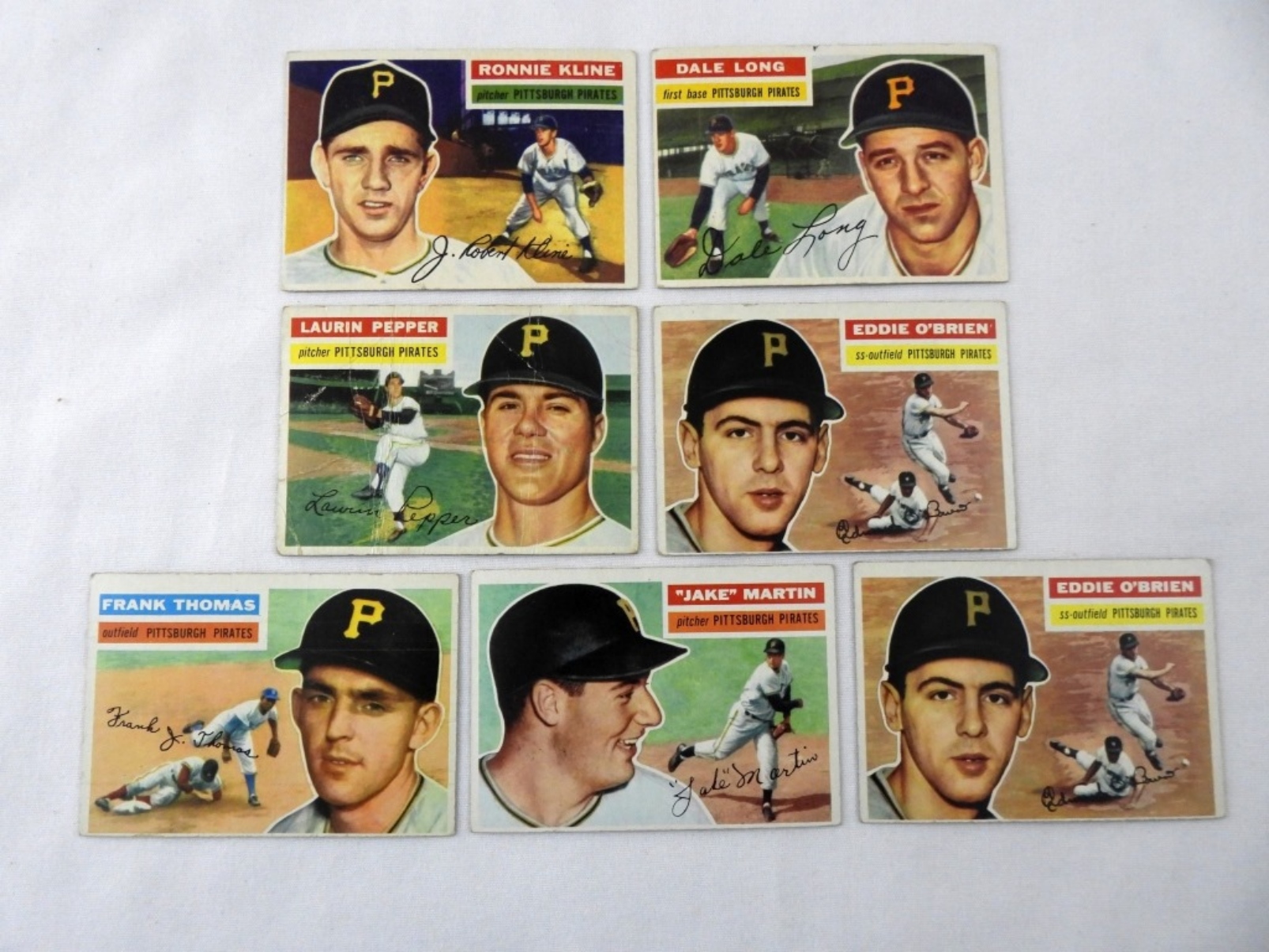 7 TOPPS 1956 PITTSBURGH PIRATES CARD LOT: 56, 94, 108 (CREASED), 116 (X2 CARDS), 129, 153. VG-VGEX SOME CREASING