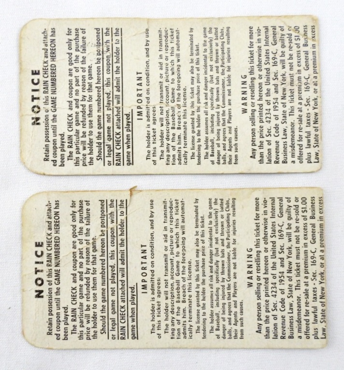 1956 WORLD SERIES TICKETS- YANKEE STADIUM- YANKEE’S VS DODGERS, SECTION 18 ROW A SEAT 17 & 18. YANKEE’S WIN 5-3. IN GOOD CONDITION DO SHOW WEAR, PRE OWNED.