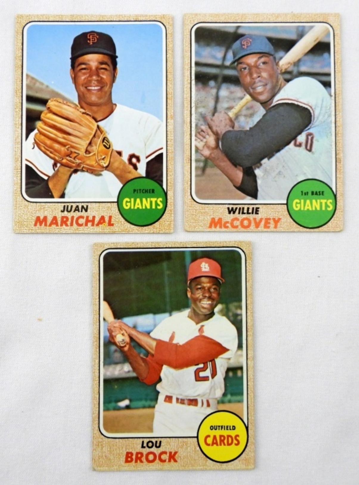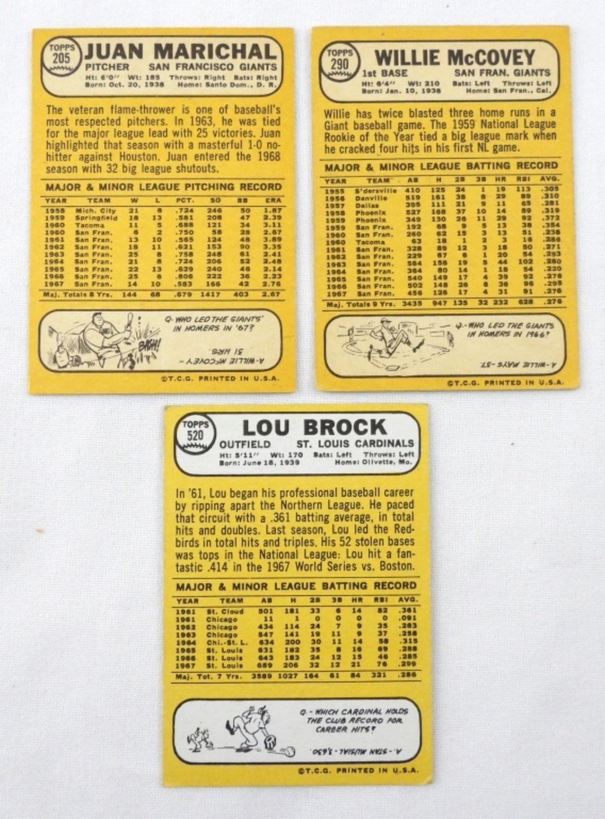 1968 TOPPS CARDS- # 290 WILLIE MCCOVEY VG, #205 JUAN MARICHAL EX, #520 LOU BROCK VGEX. NO CREASES.