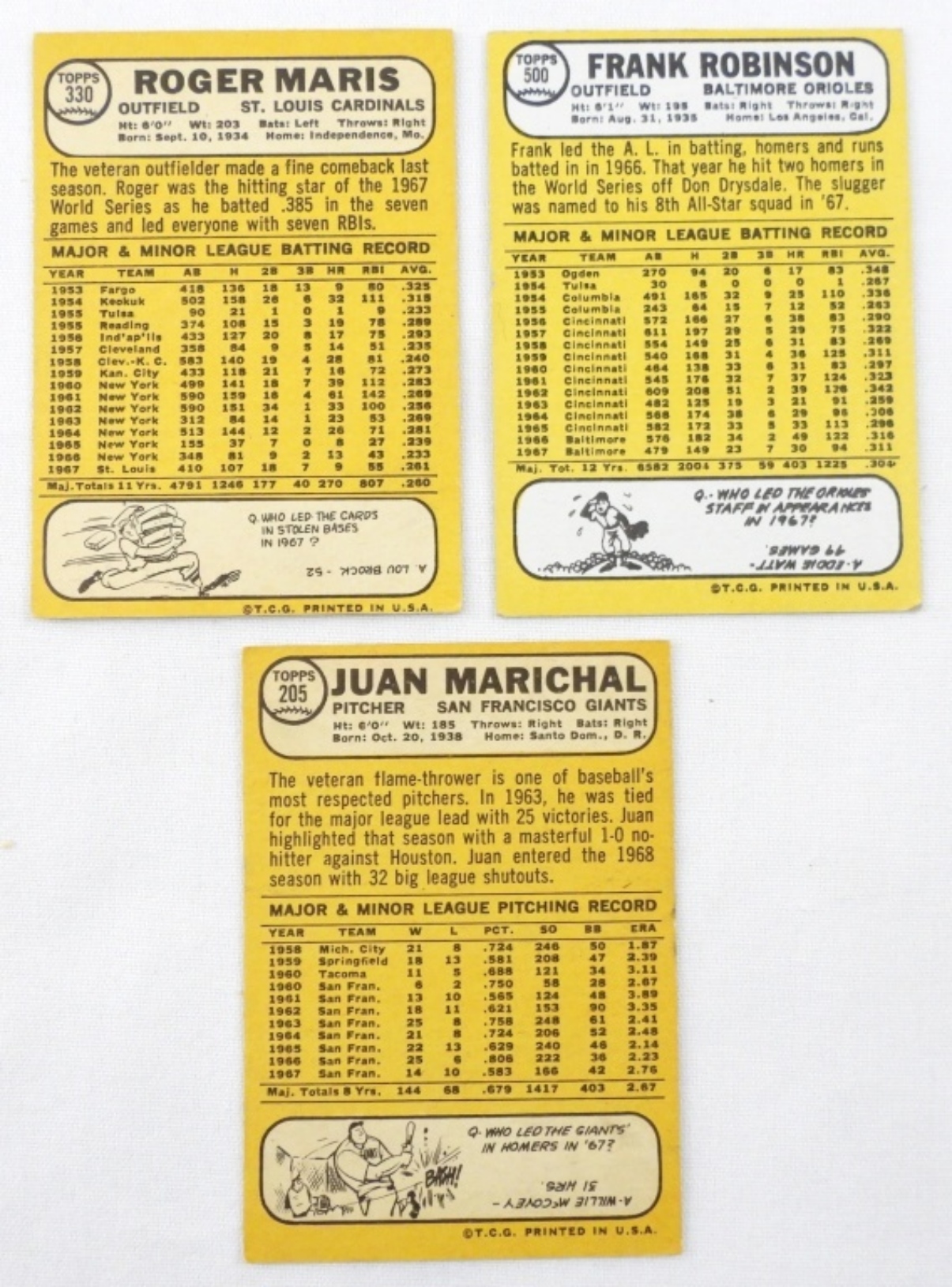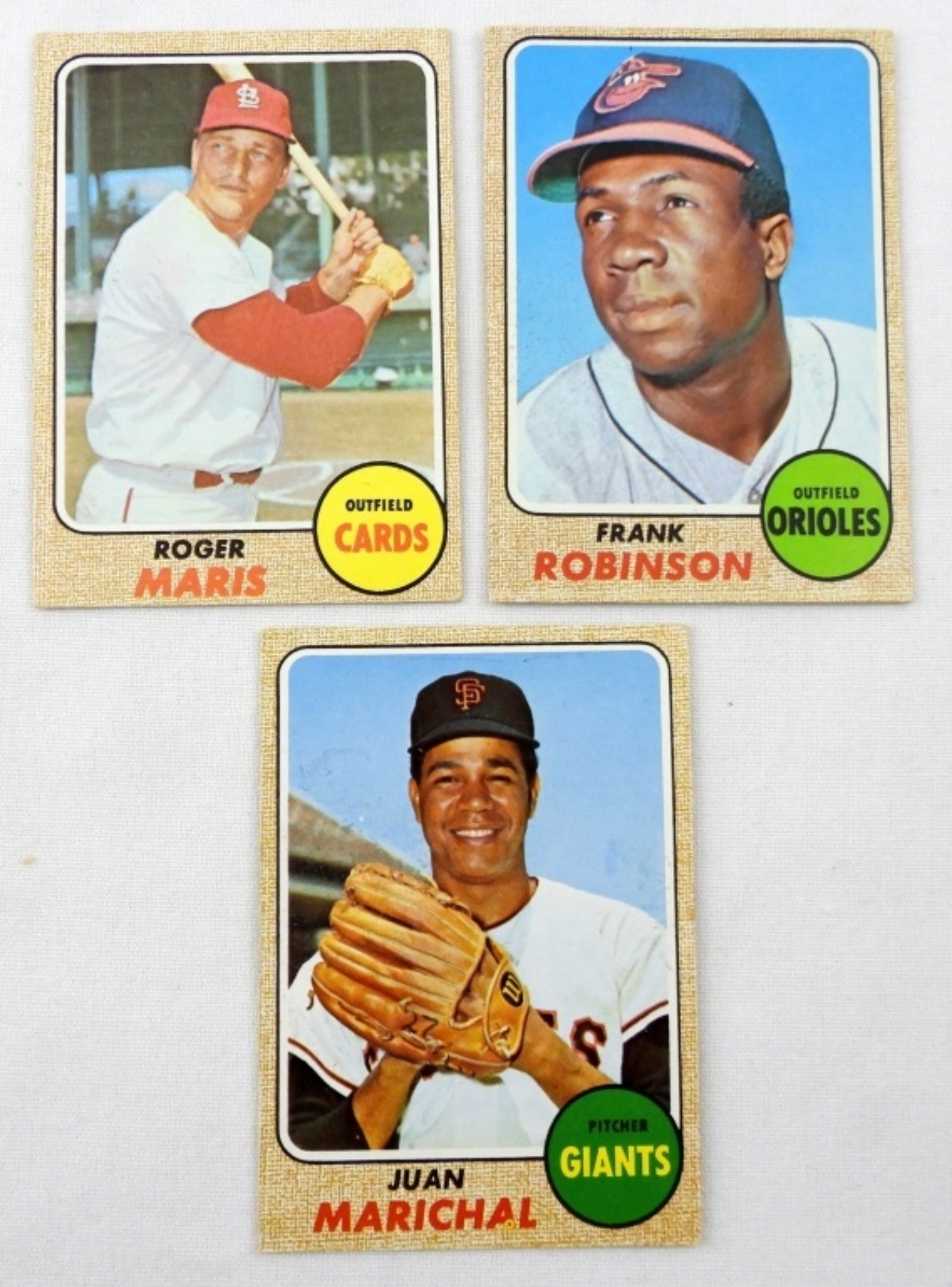 1968 TOPPS CARDS- #500 FRANK ROBINSON EX, #330 ROGER MARIS VGEX, #205 JUAN MARICHAL VGEX. NO CREASES.
