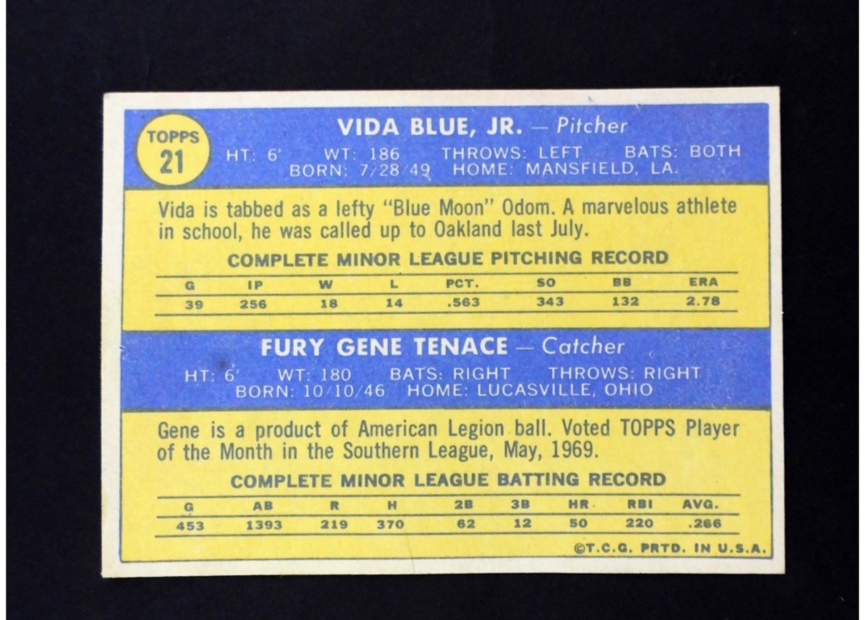 1970 TOPPS #21 ROOKIE STARS ATHLETICS VIDA BLUE AND GENE TENANCE, VGEX