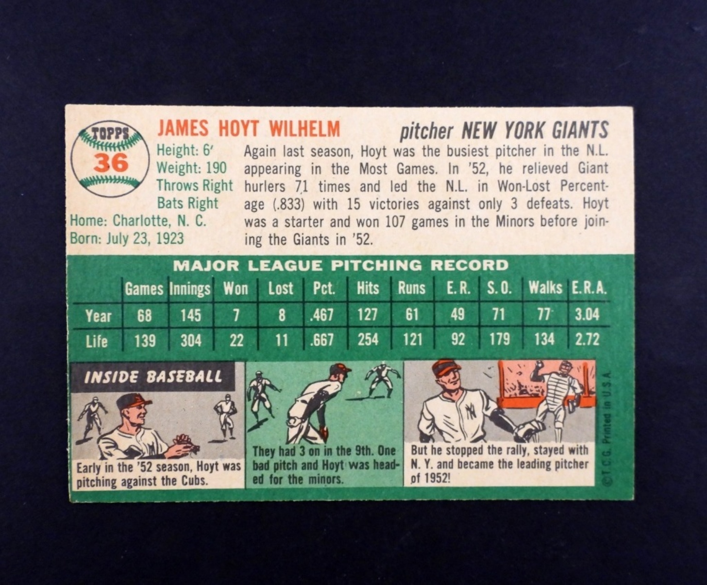 1954 HOYT WILHELM PITCHER NEW YORK GIANTS TOPPS #36, VGEX