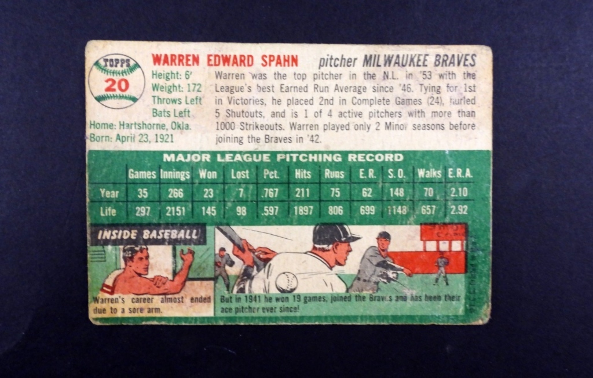 VG (SOME CREASING), WARREN SPAHN TOPPS #20 CARD, BID NOW!