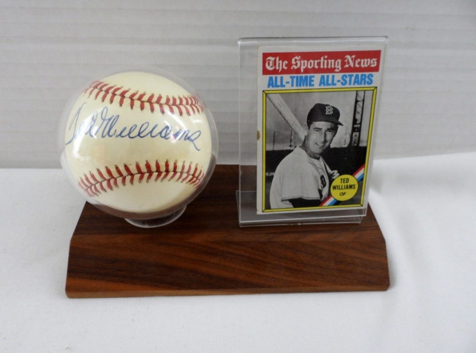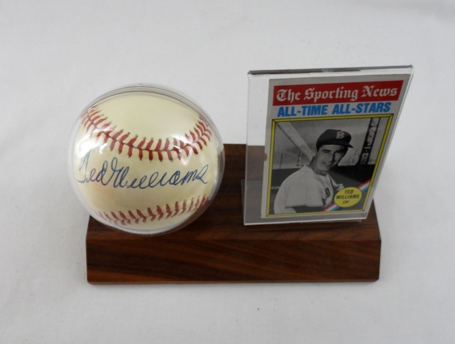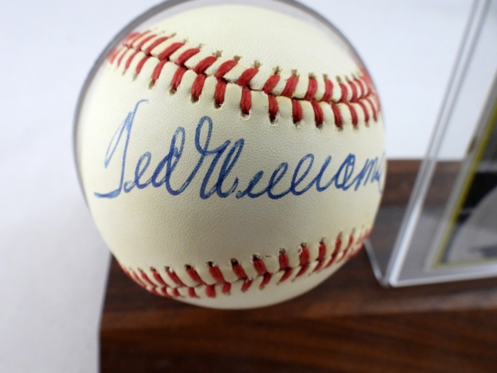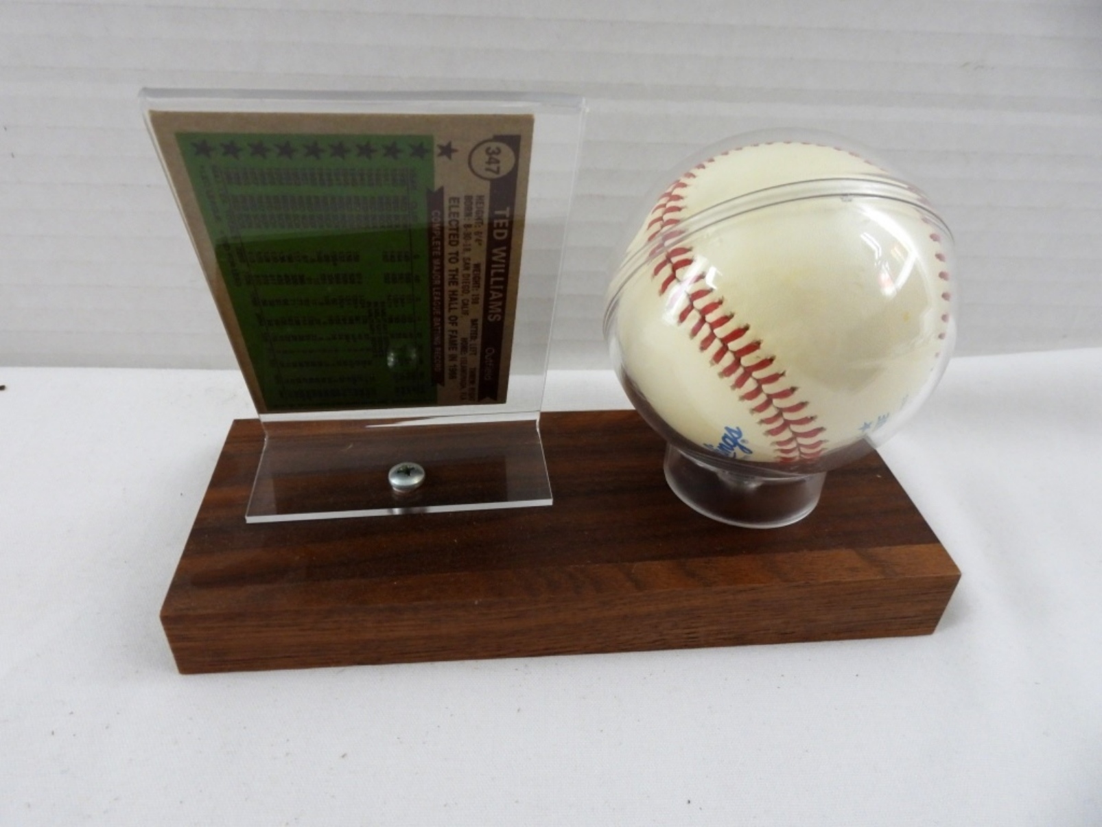 BCW BALL AND CARD HOLDER, CONTAINS SIGNED TED WILLIAMS BALL WITH COA AND 1978 TOPPS 347 CARD – UNVERIFIED