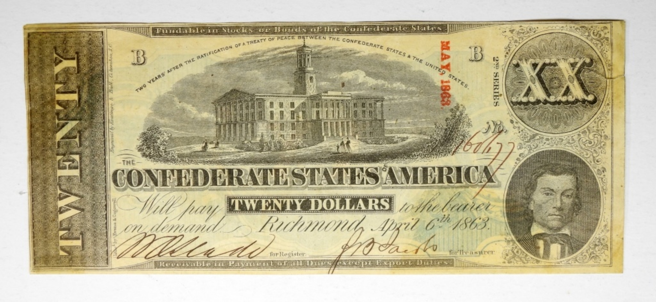 1863 $20 TEAR CONFEDERATE STATES OF AMERICA