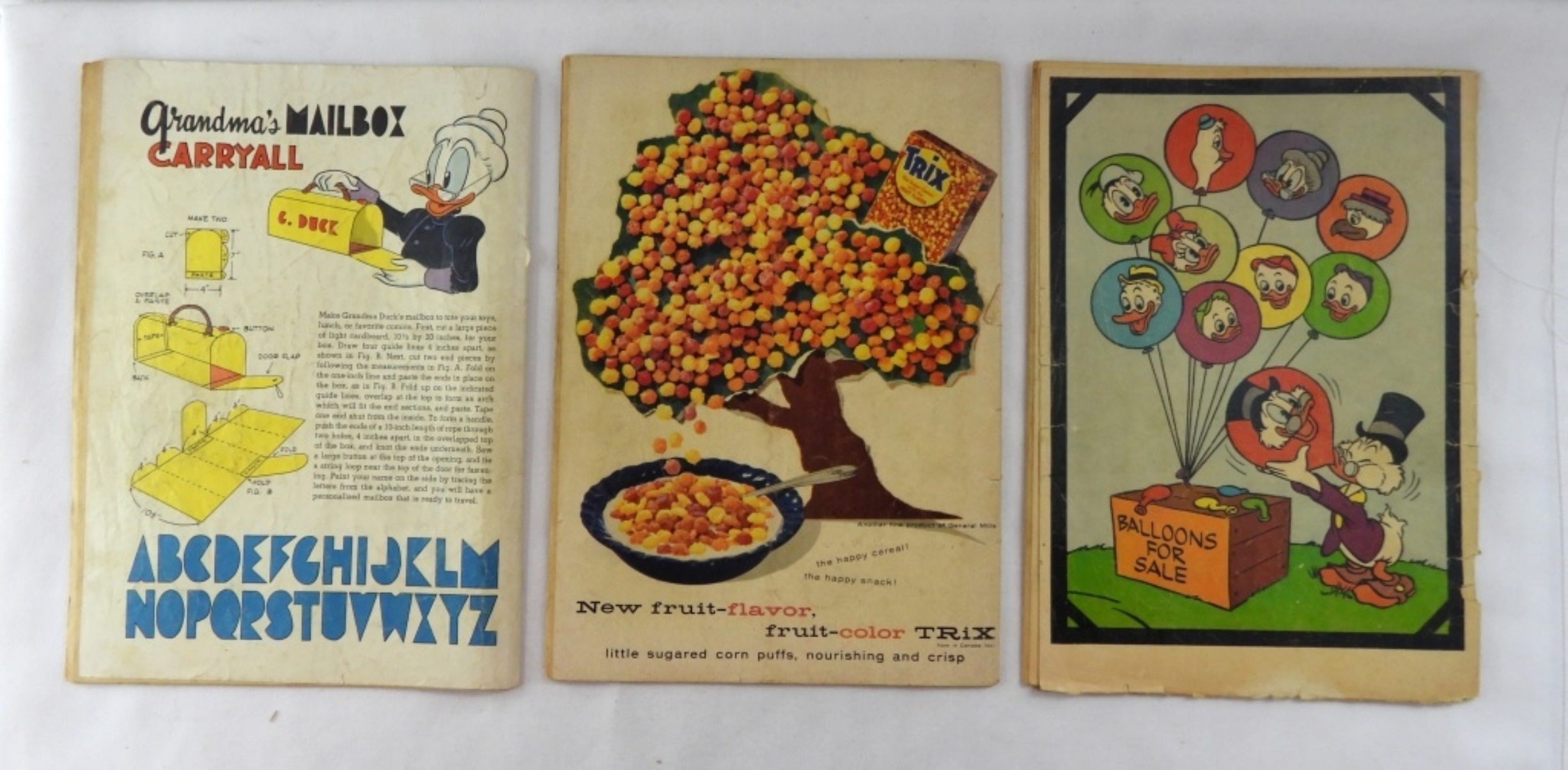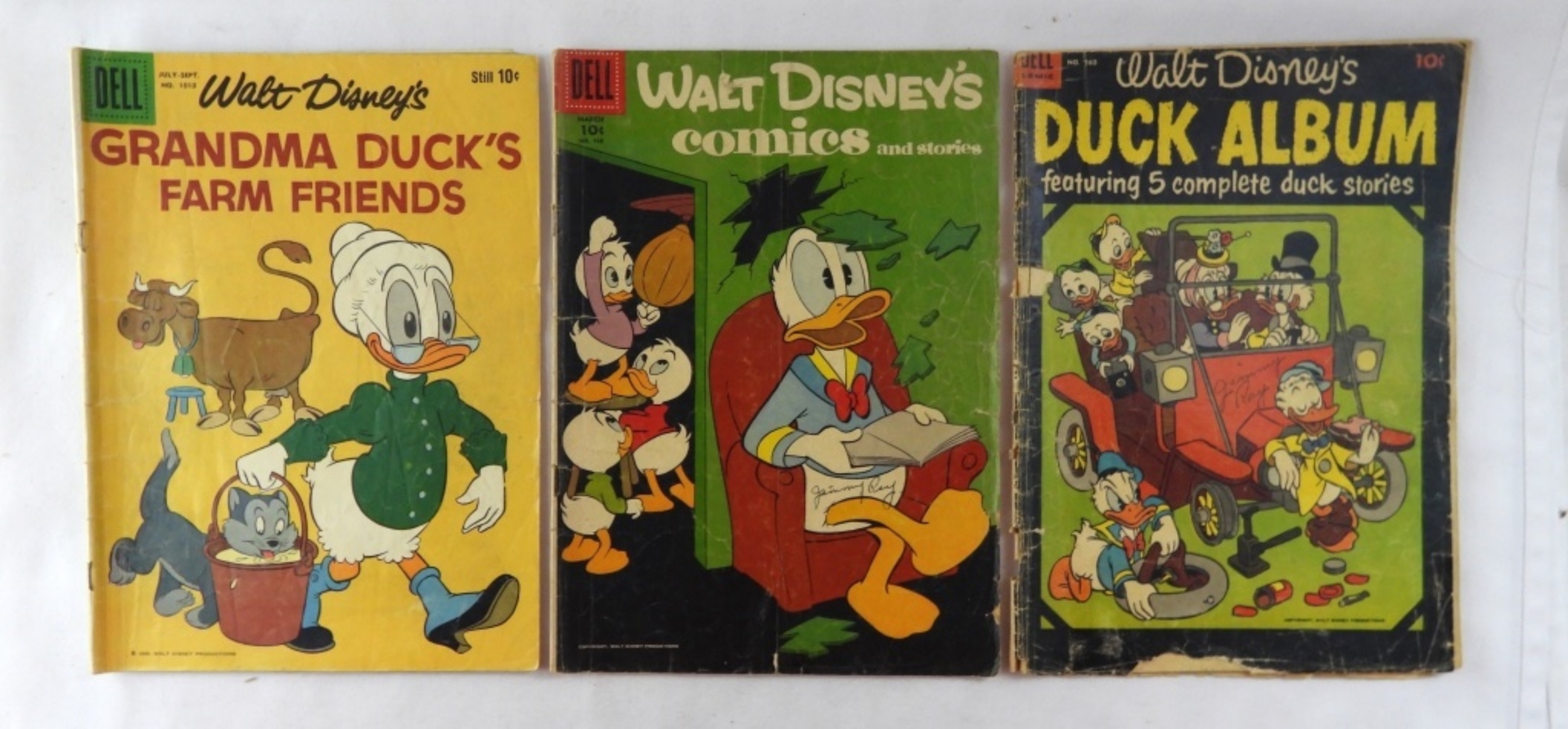 3 DELL WALT DISNEY DUCK ALBUM FEATURING F5 COMPLETE DUCK STORIES NO. 560, 1954 IN FAIR TO GOOD CONDITION (DOES SHOW WEAR ON THE SPINE, HAS CREASES, SOME PEN MARKS). WALT DISNEY’S COMICS AND STORIES VOL. 17, NO 6,