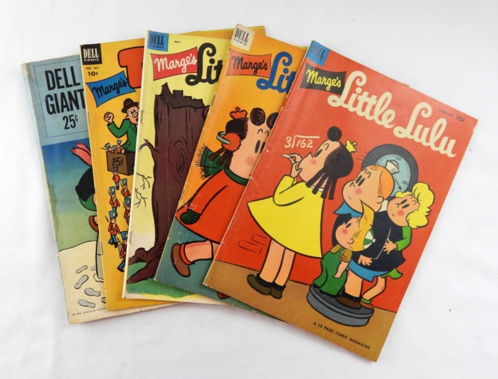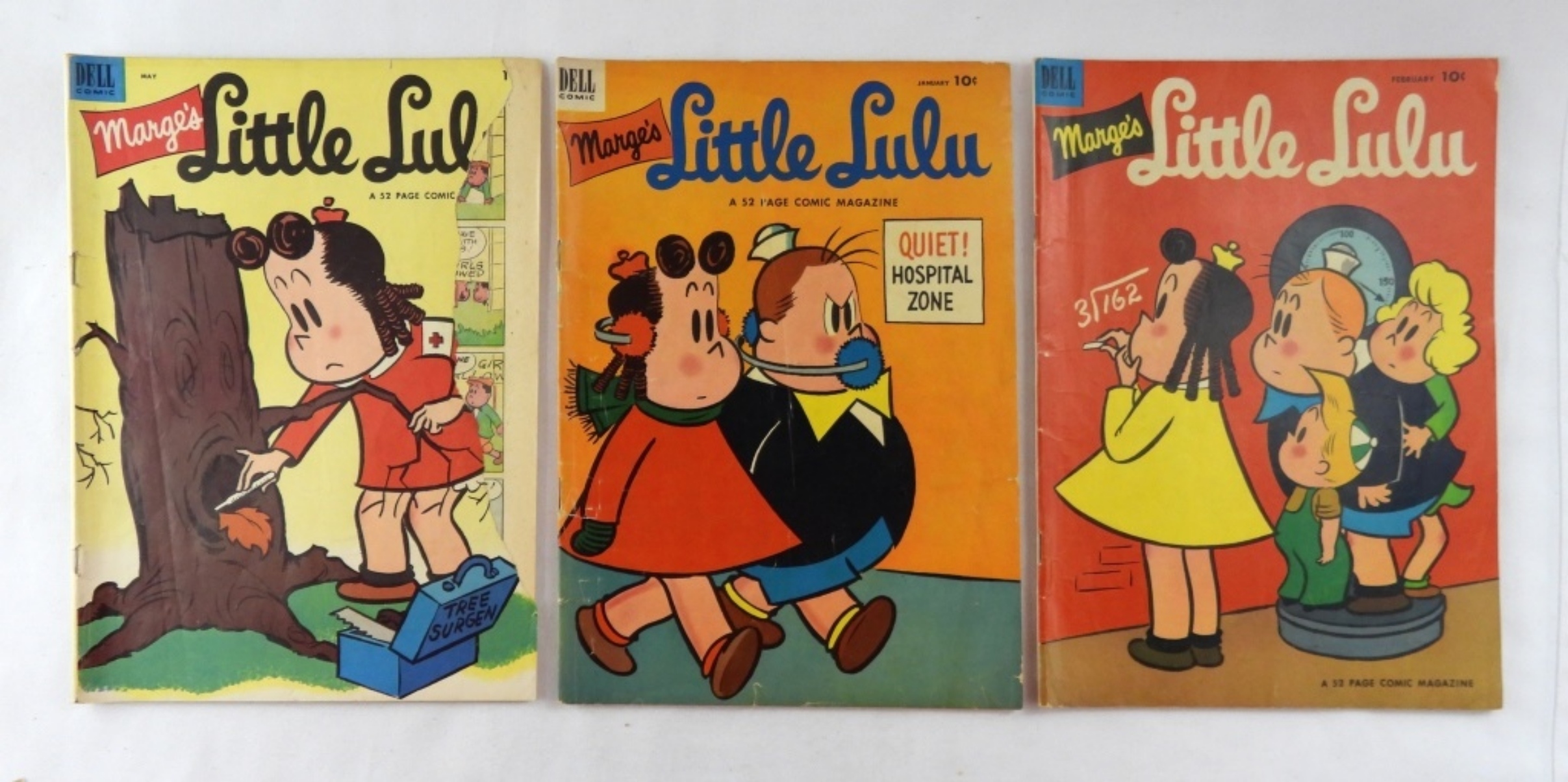 DELL COMICS- 3 MARGE’S LITTLE LULU VOL. 1 # 56, 55, 59 (SHOW WEAR, DOES HAVE SOME TEARS ON SOME, AND SOME CREASES) IN FAIR TO GOOD CONDITION. 1-DELL GIANT- MARGE’S LULU AND TUBBY IN ALASKA – NO. 1, 1959- DOES SHOW