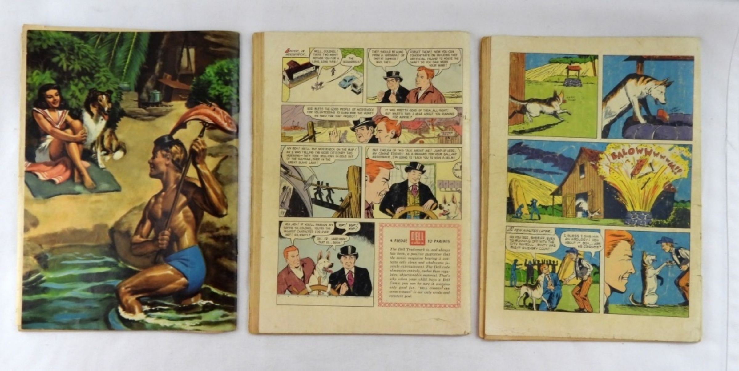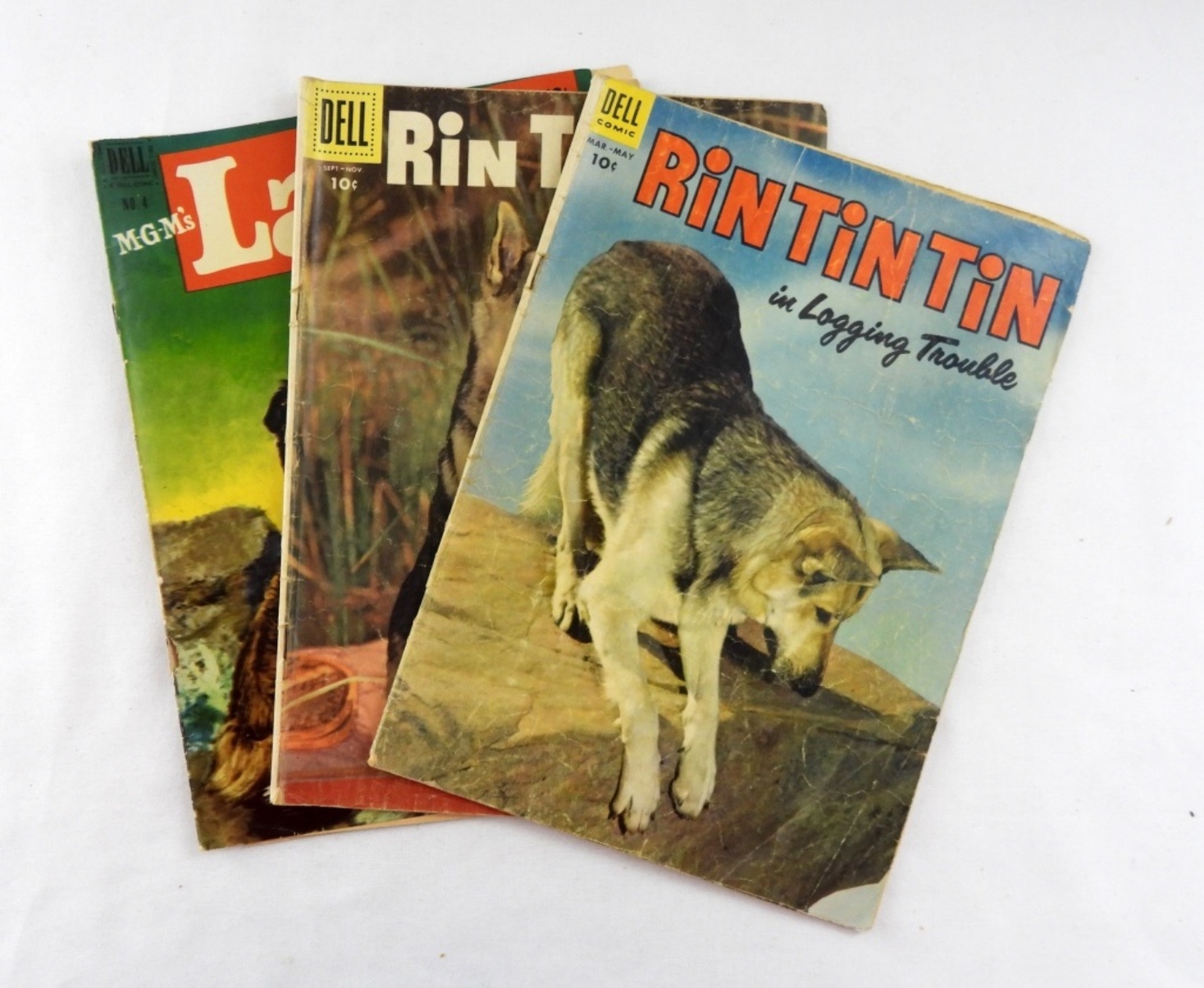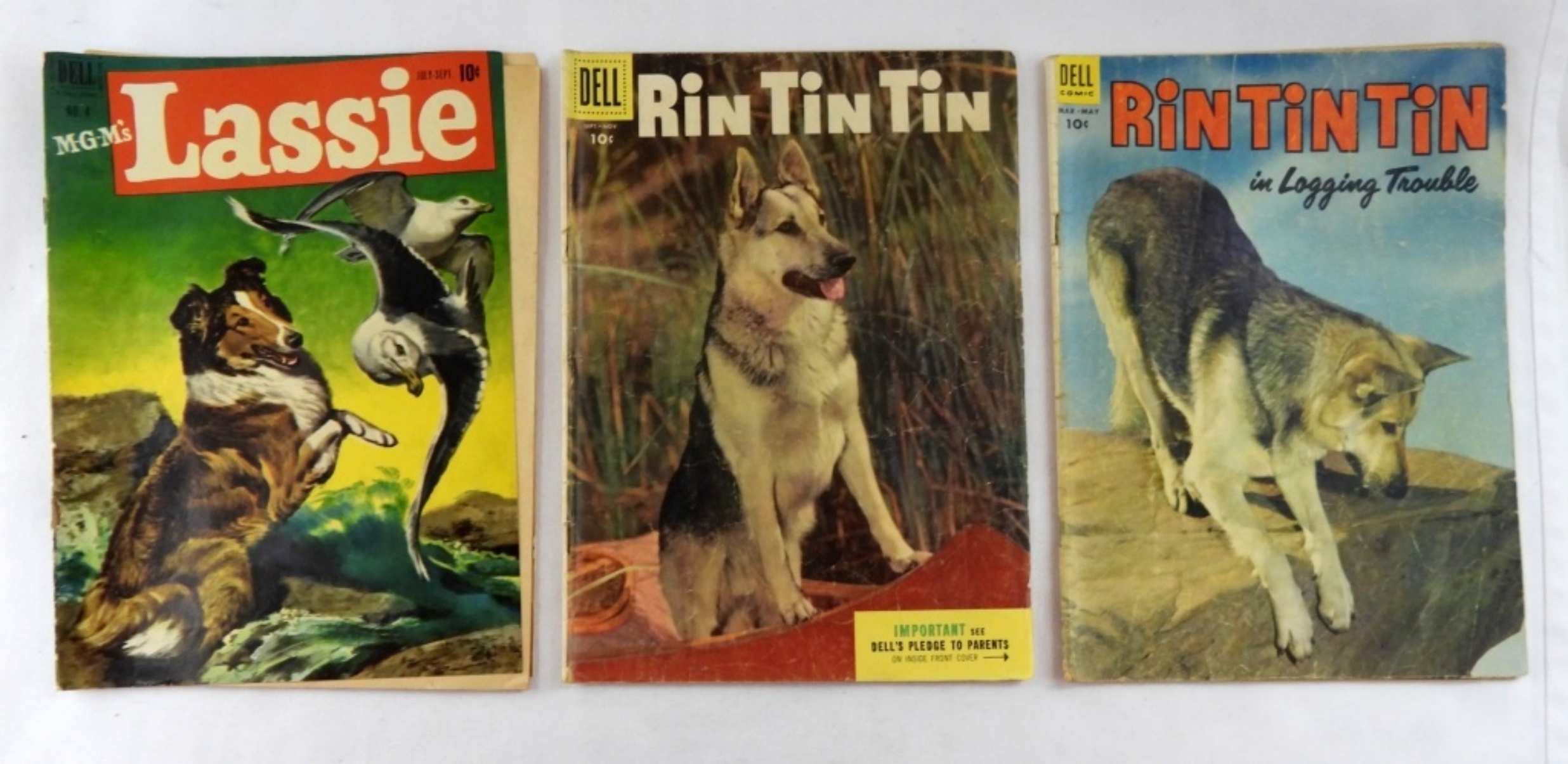 DELL RIN TIN TIN IN LOGGING TROUBLE- NO.4, 1954. RIN TIN TIN- NO. 10, SEPT- NOV. 1955. MGM’S LASSIE- NO. 4, JULY-SEPT 1951. ALL OF THESE COMICS ARE IN FAIR TO GOOD CONDITION. SHOW SOME WEAR, ALL HAVE BEEN PREOWNED.