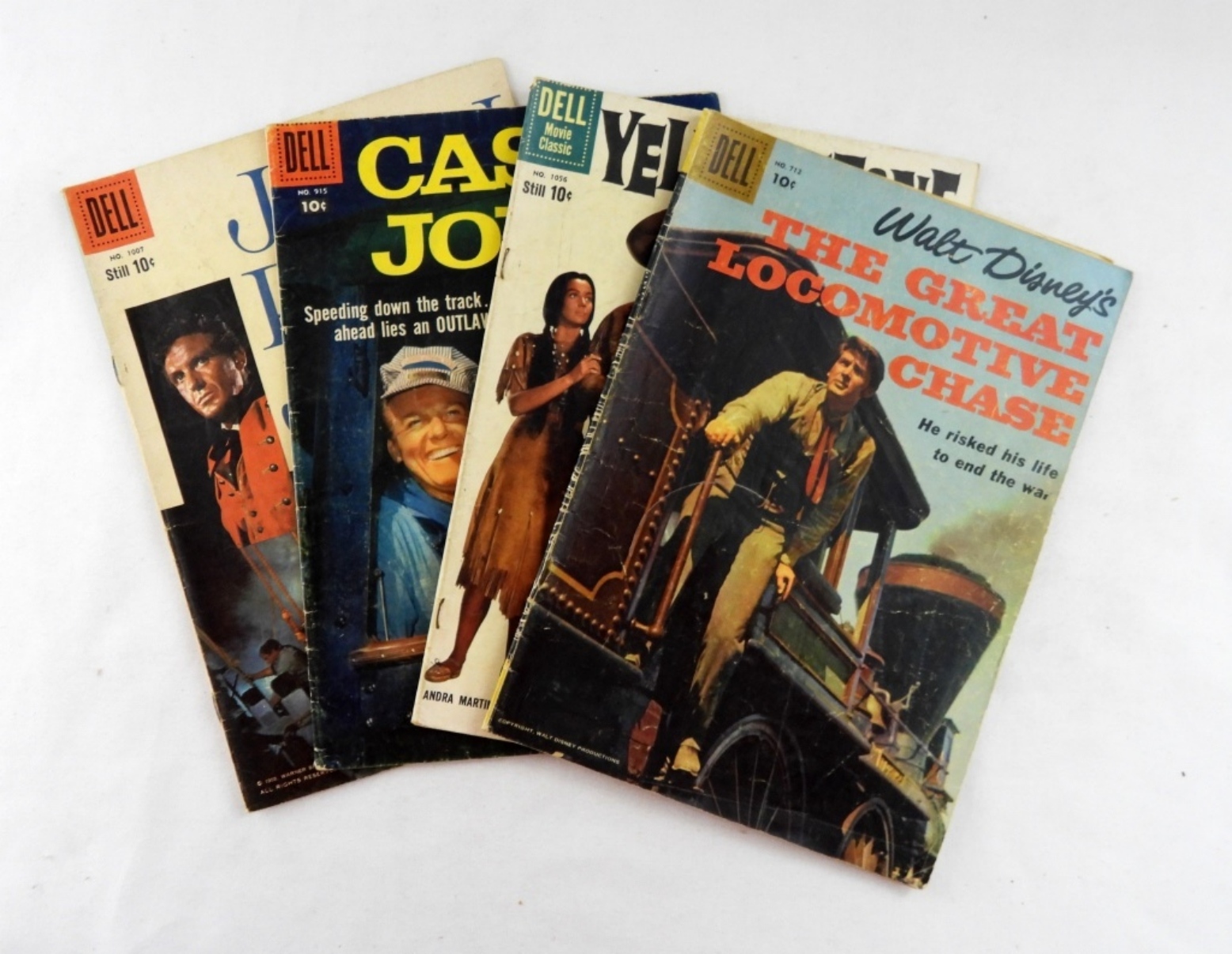 (4) DELL SILVER AGE COMICS MIXED LOT- WALT DISNEY’S THE GREAT LOCOMOTIVE CHASE- NO. 712, 1956- FAIR TO GOOD CONDITION SHOWS WEAR, AND HAS SOME CREASES. YELLOWSTONE KELLY NO. 1056, 1959- IN GOOD CONDITION SHOWS WEAR.