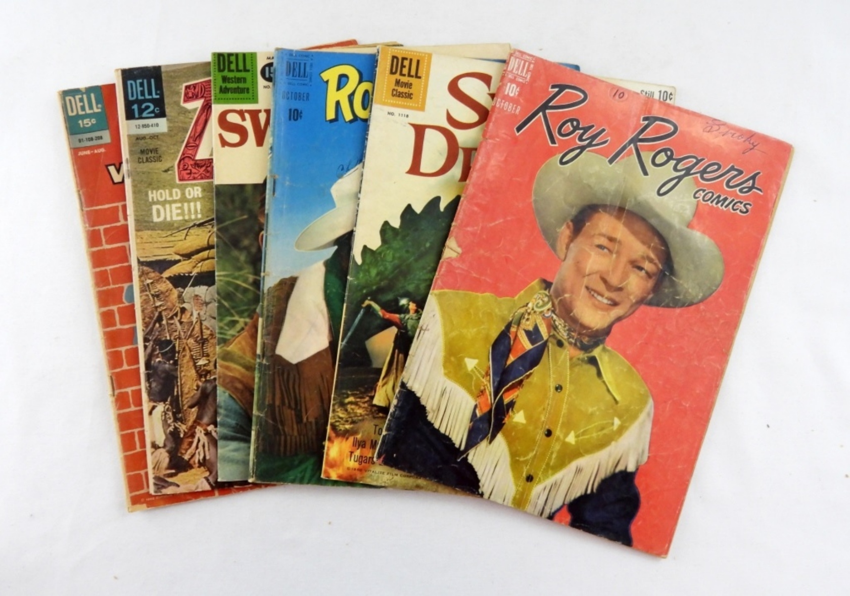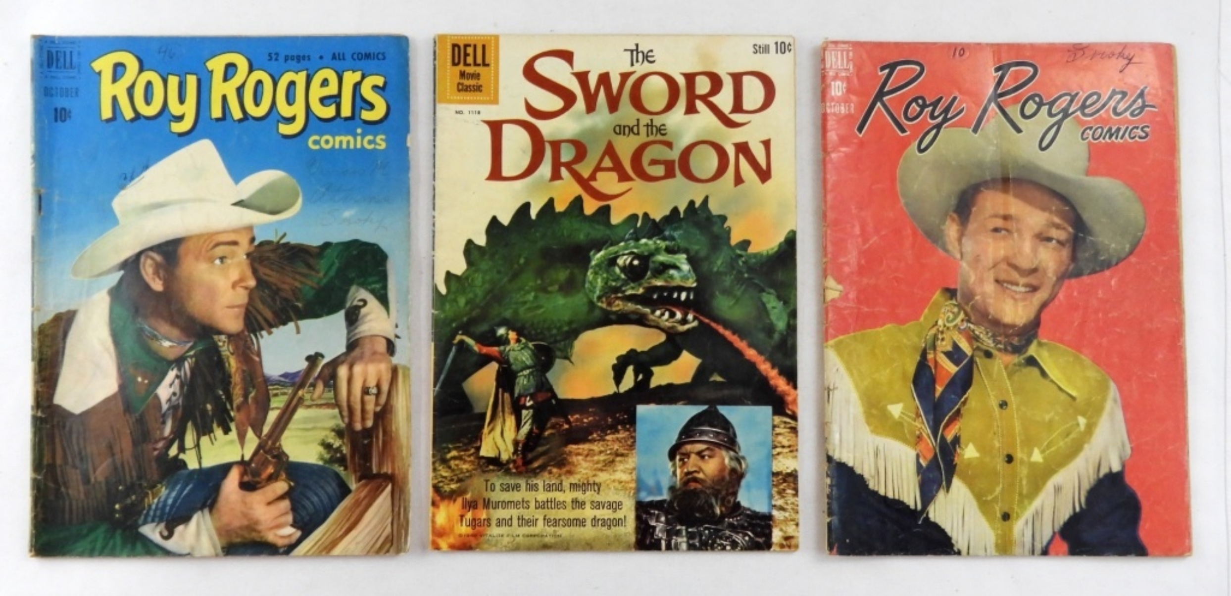 ROY ROGER COMICS- VOL 1, NO. #10, OCTOBER 1948- IN FAIR TO GOOD CONDITION SHOWS WEAR. THE SWORD AND THE DRAGON NO.# 1118, 1960- IN GOOD CONDITION. ROY ROGERS VOL 1, NO. 46, OCTOBER 1951- IN GOOD CONDITION. WALT