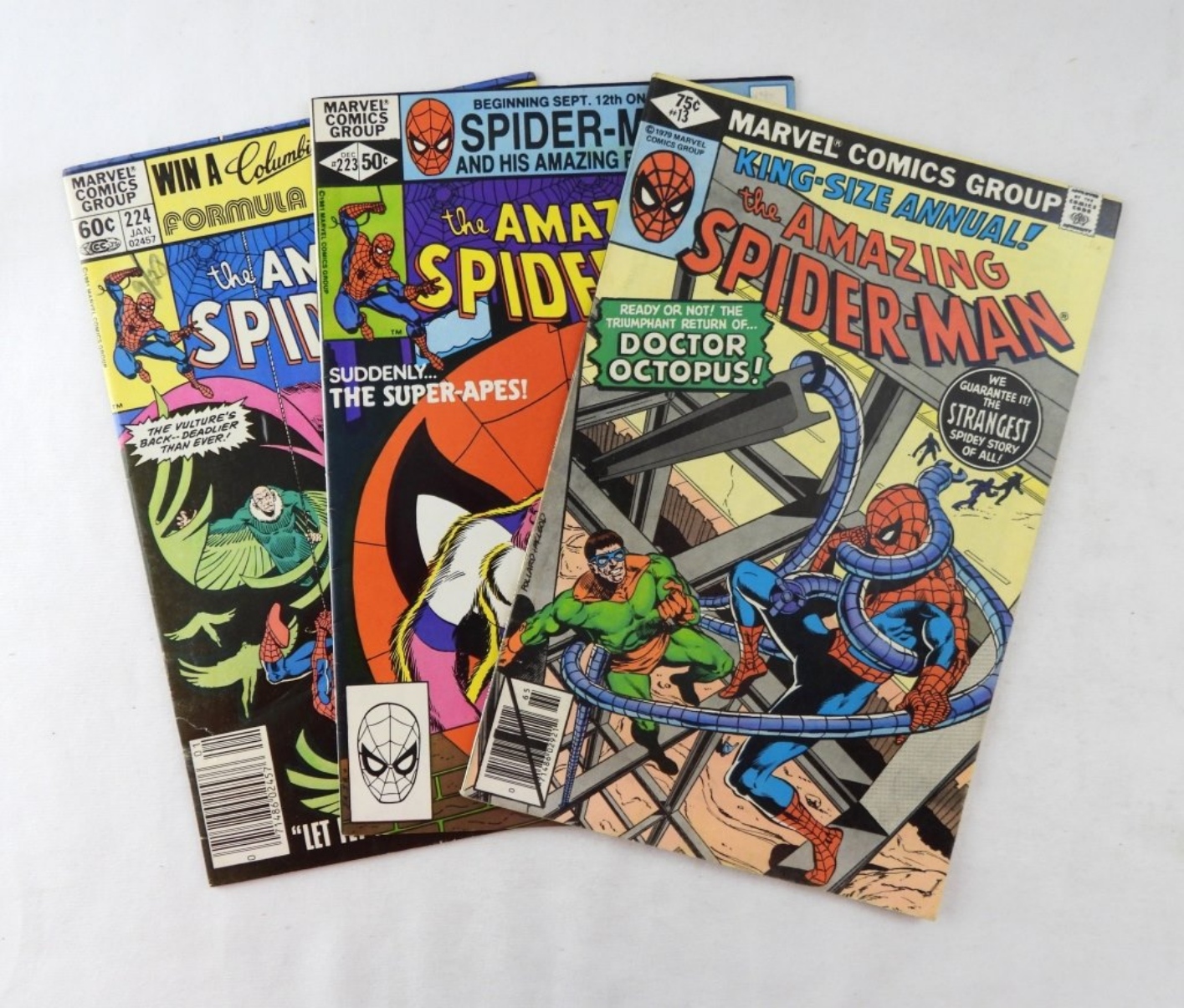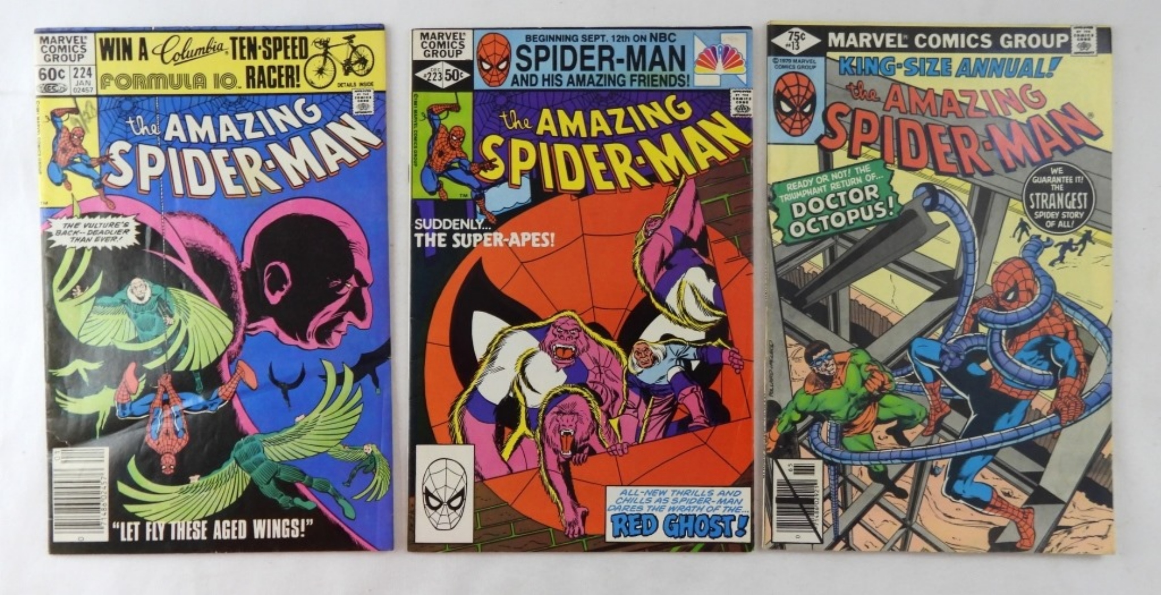 MARVEL COMICS- THE AMAZING SPIDERMAN VOL 1, NO. 13. THE AMAZING SPIDERMAN VOL. 1, NO. 1987. THE AMAZING SPIDERMAN VOL. 1, NO 224, JAN 1982. ALL OF THESE COMICS SHOW A LITTLE WEAR, HAVE BEEN PREOWNED, IN GOOD CONDITION.