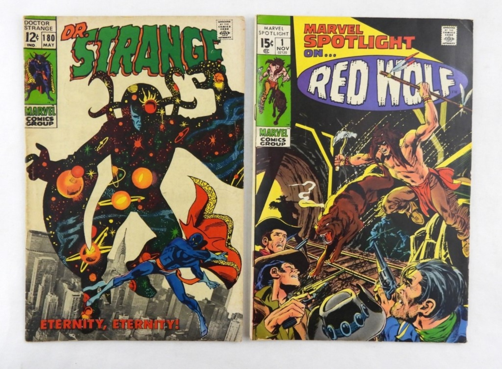 MARVEL COMICS- DR. STRANGE VOL. 1, NO. 180, MAY 1969 IN FAIR TO GOOD CONDITION DOES SHOW SOME WEAR, HAS A PEN MARK INSIDE THE FRONT COVER ON THE FIRST PAGE PREOWNED. MARVEL SPOTLIGHT ON… RED WOLF VOL. 1, NO. 1,