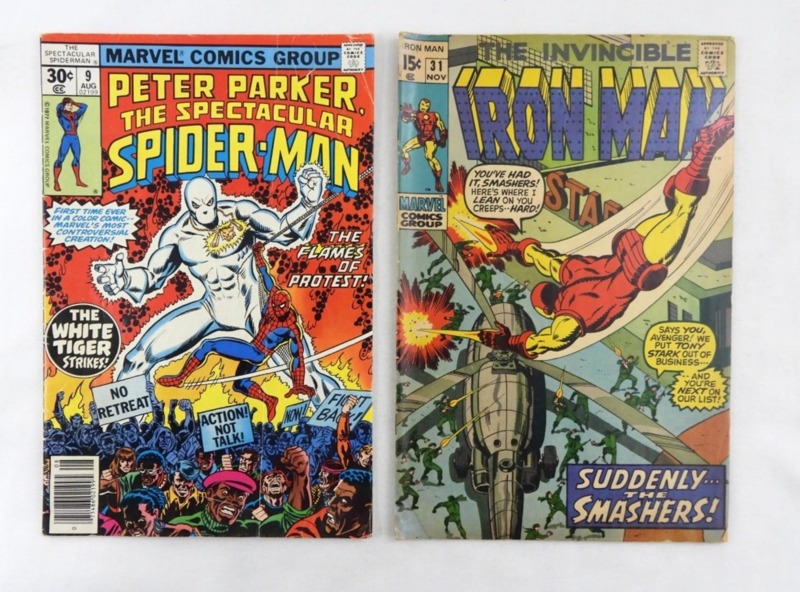 MARVEL COMICS- THE INVICIBLE IRON MAN VOL. 1, NO. 31, NOVEMBER 1970- IN FAIR TO GOOD CONDITION DOES SHOW SOME WEAR. PREOWNED. PETER PARKER, THE SPECTACULAR SPIDER-MAN VOL, NO. 9, AUG 1977- IN FAIR TO GOOD CONDITION.